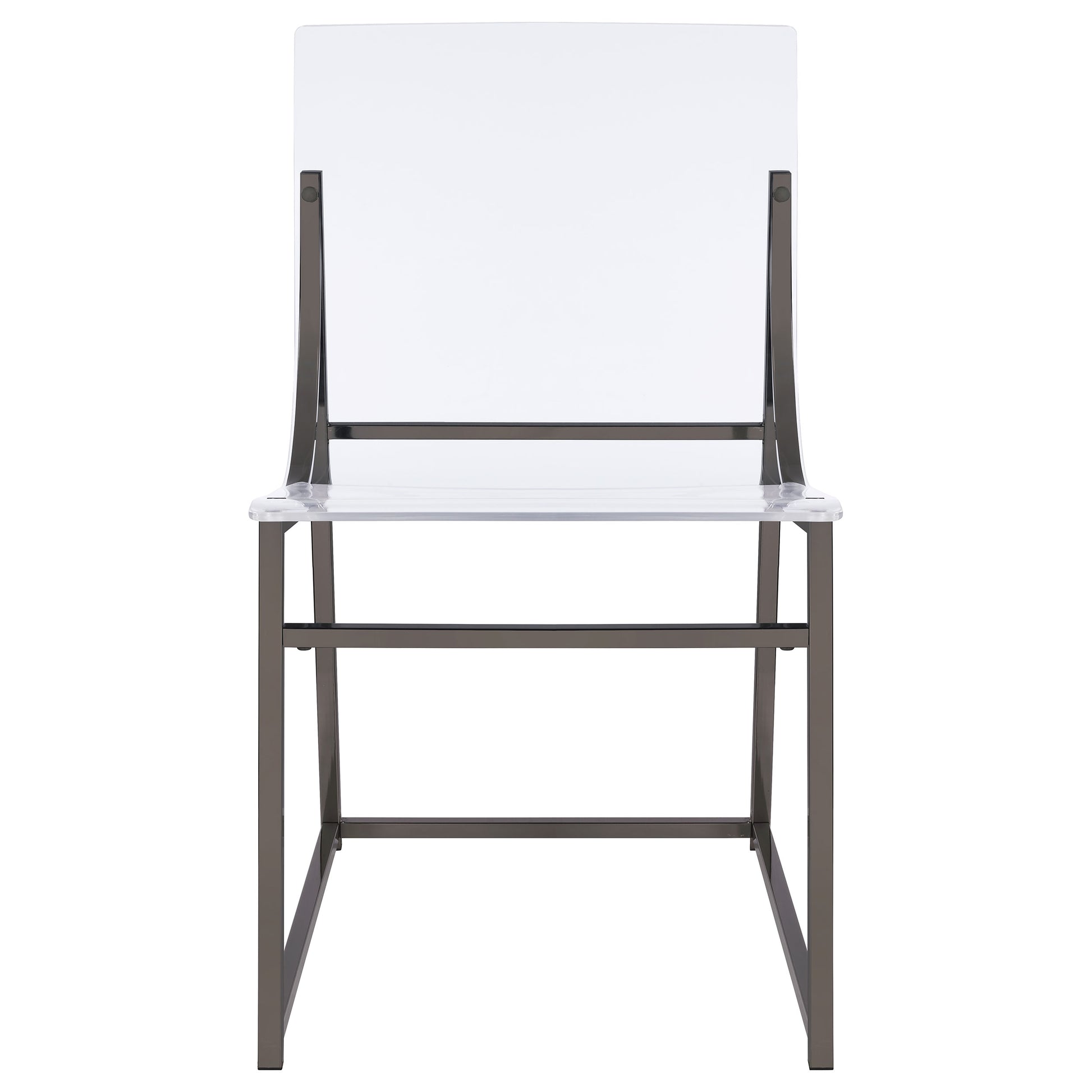 Step into the world of nouveau interior design with chairs that will turn conventional style on its head and become a central focus in your contemporary living environment. Customized for the experimental stylist, this set of two side chairs deliver surprising comfort, dabbling in a mix of materials striking a balance between industrial classic and pop culture retro design aesthetics. A metal frame with subtly rounded angles and straight lines forms a no-fuss look that relies on trending simplicity. A clear acrylic sheath is sturdy enough to support weight and provide a peek-a-boo view of the frame back. Paired with a table that duplicates its creative design, these chairs add unforgettable personality.