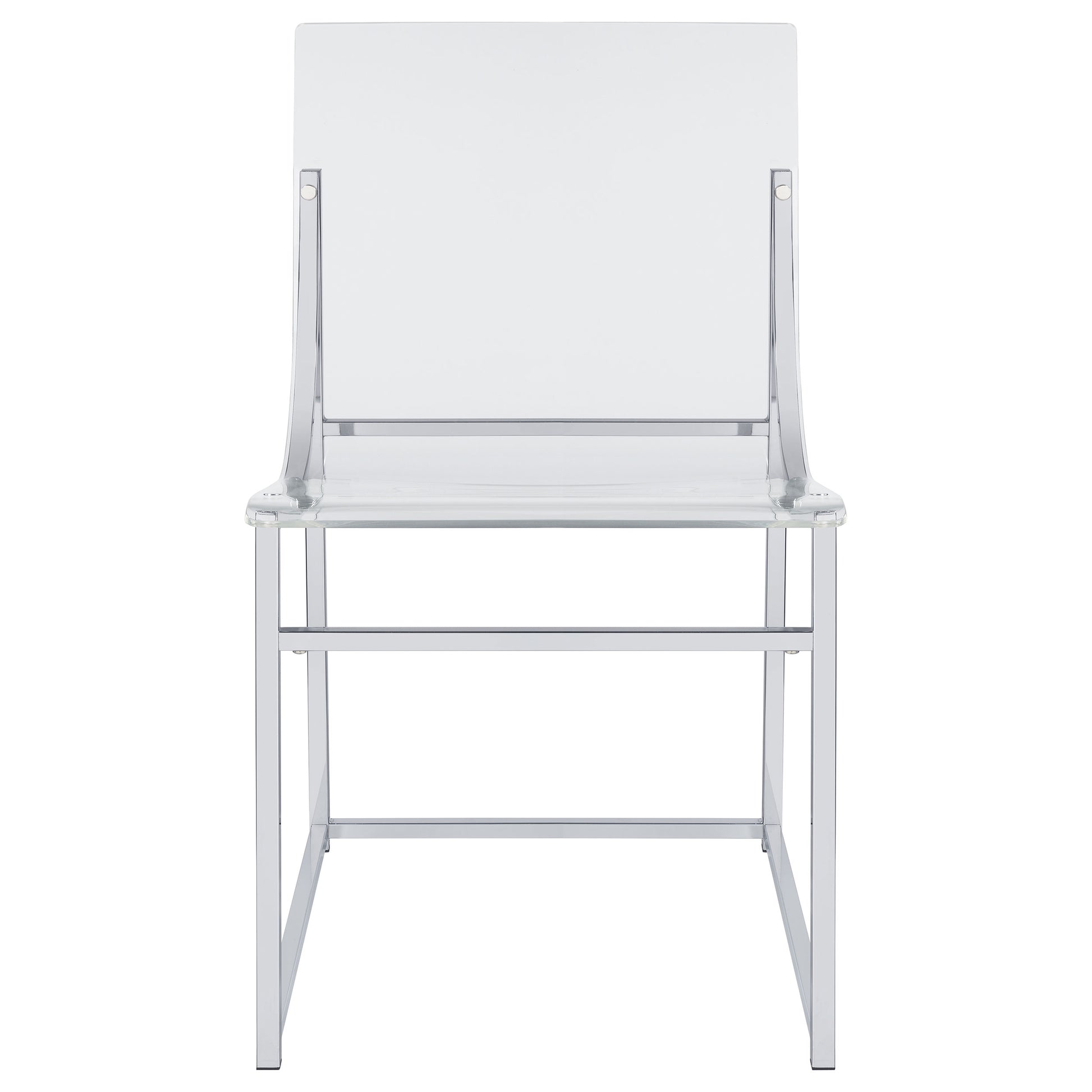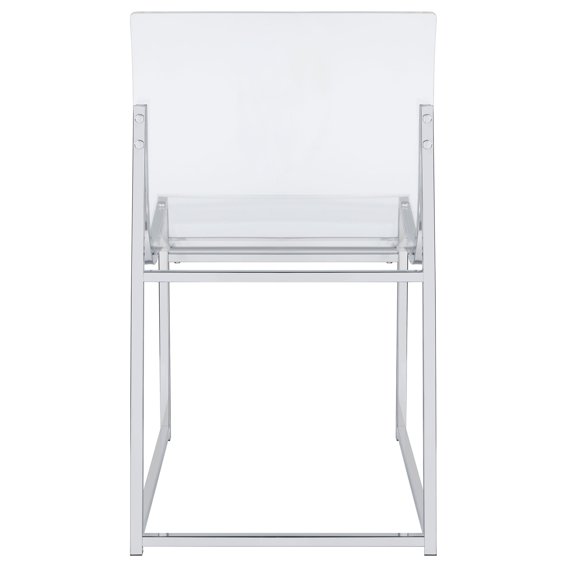 Spin up a stylish, modern refresh for your dining table with a set of two contemporary side chairs. Clear acrylic and graceful curves create a comfortable, minimalist seat and back, offering comfort that dresses up or down to suit your space. Each chair is built with a sled-inspired base crafted from square tube metal for optimal durability. Gleaming chrome finish ensures the frame stands out and provides a sense of sophisticated structure at any table. Clean lines in the frame perfectly contrast the curvature of the seat, delivering a sophisticated sense of contrast and visual tension.