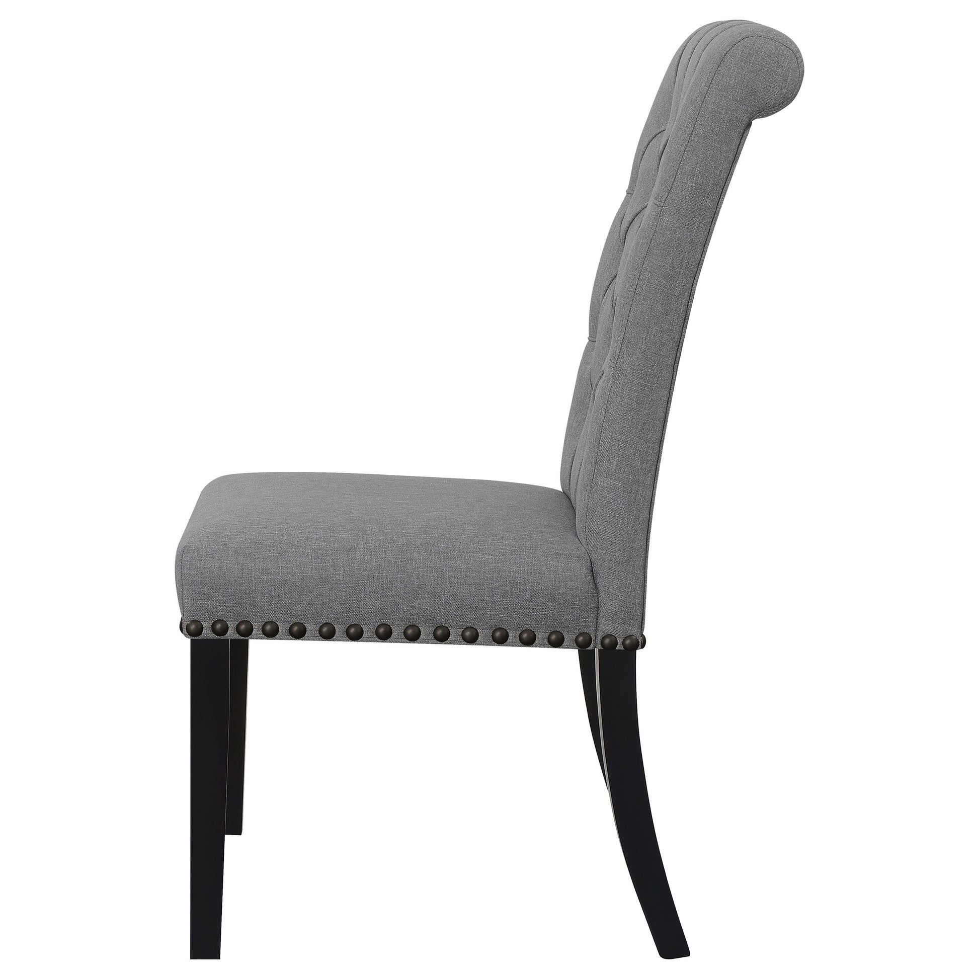 Versatile and elegant, this transitional side chair lends a classical touch to a variety of home decor styles. A rolled backrest with button tufted details lends a traditional aesthetic to a space. Pushing the classic elements is a padded seat with individual nailhead trim that offers a charming detail. Rest easy in this supportive, comfy seat, wrapped entirely in a linen-like fabric that offers a soft touch. Elevated by square shape tapered legs in a rustic espresso finish, this graceful side chair creates a wonderful addition to dining rooms, home offices and more.