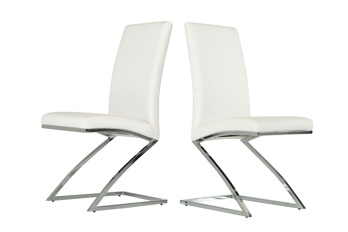 The Modrest Angora Modern White Dining Chair stands with style featuring a polished chrome frame with seat and back upholstered in exquisite white leatherette. Featuring a Z-shape chrome base, it has a dimension of W17" x D18" x H39" and a seat height of 17". This modern dining chair is sold in increments of 2 and requires some assembly.