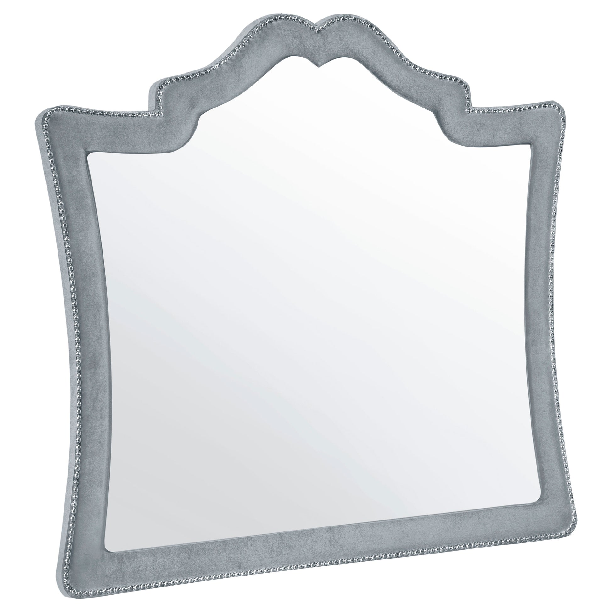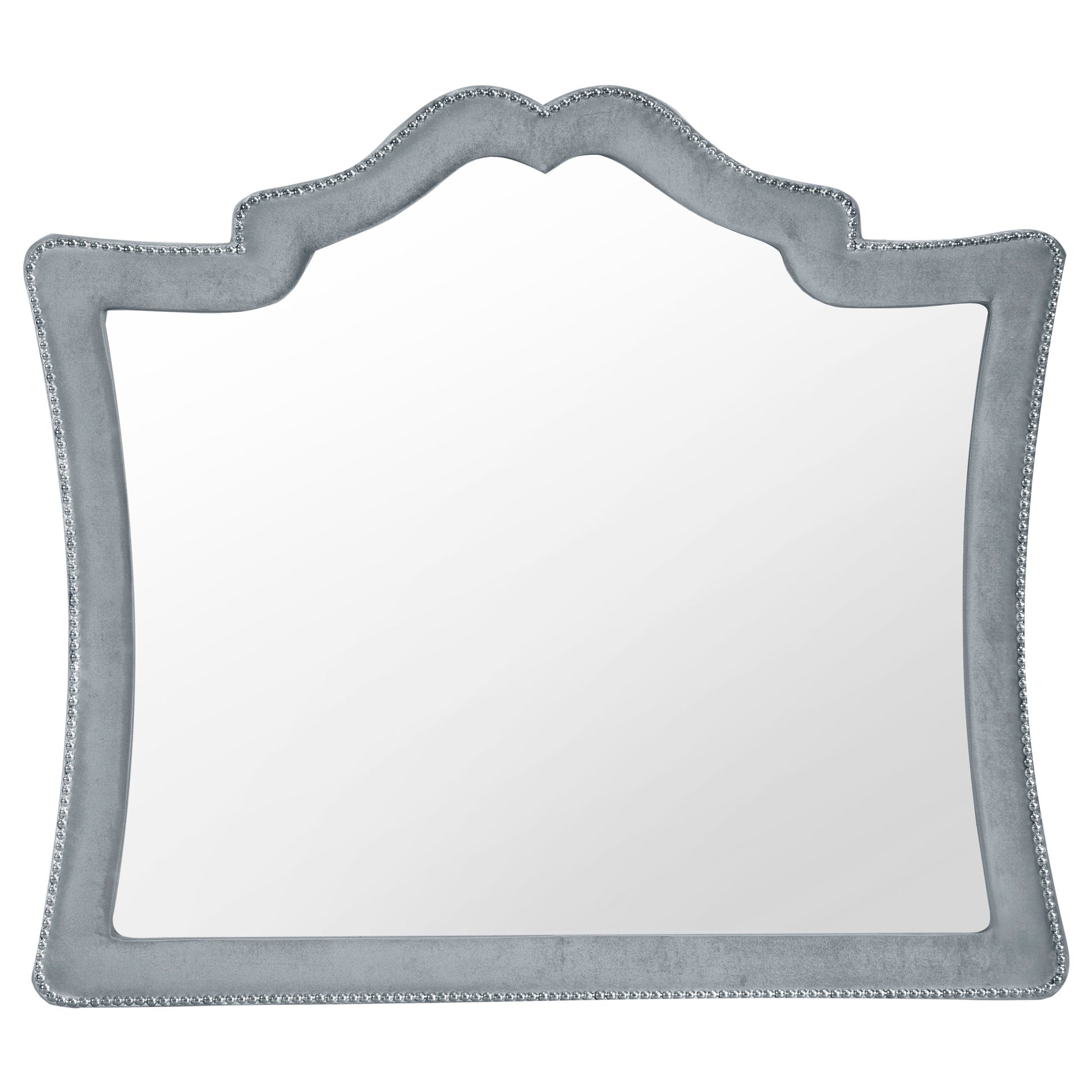 Put the finishing touches on your Antonella collection bedroom with a beautiful framed mirror. The ideal companion to your dresser, the mirror turns your dresser top into a perfect spot for morning beauty and grooming rituals, while adding brightness and reflectivity to your bedroom. The mirror is gracefully shaped to match the headboard in this lovely collection, offering romantic flair and eye-catching elegance. The mirror frame is beautifully upholstered in soft gray velvet. Chrome finish nailhead trim gleams as it catches the light, adding dimensionality to a classic bedroom accent piece.