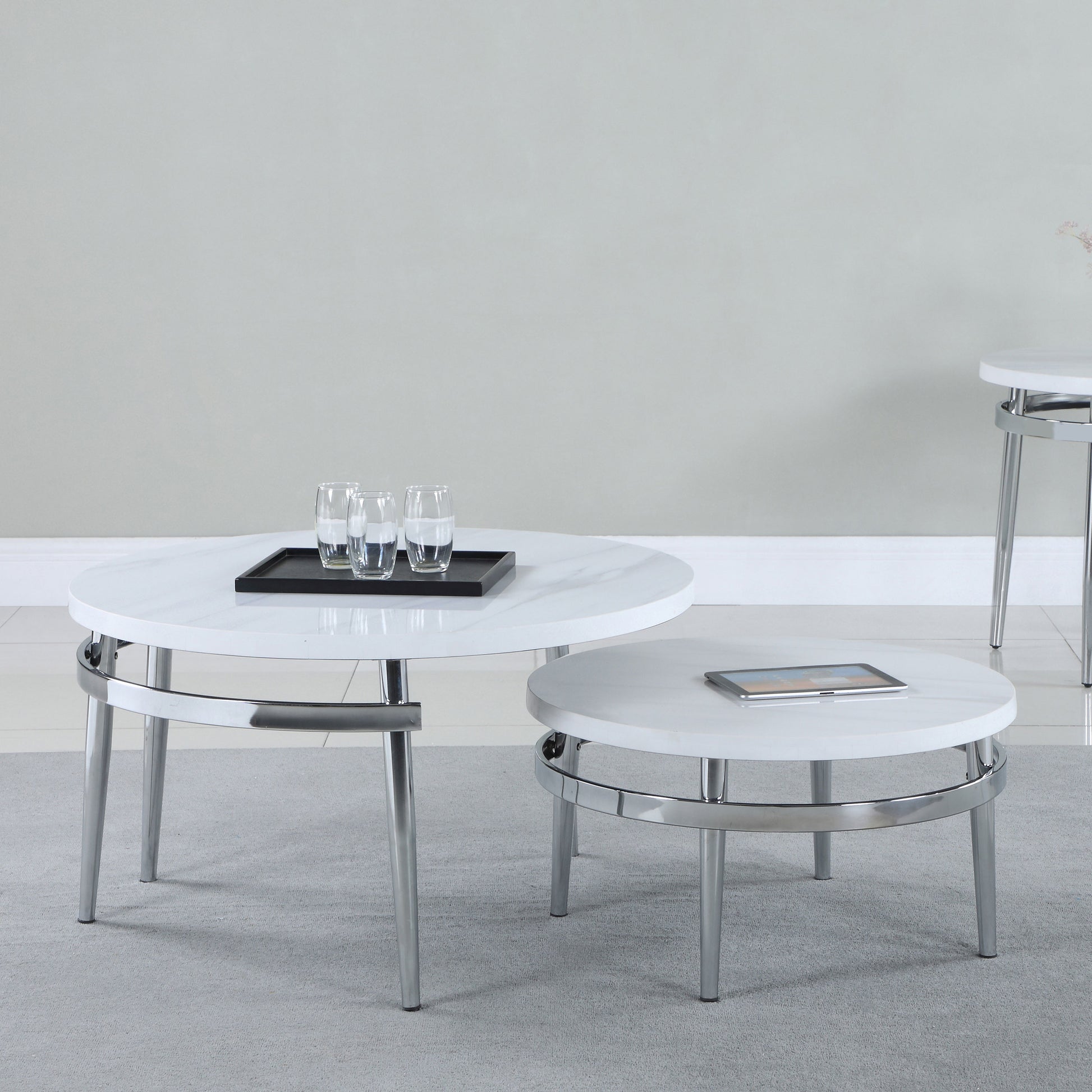 Perfectly suited for a modern style living room, this set of nesting coffee tables are as stylish as they are versatile. Each with a round cultured marble top, complete with grey striations, they offer a cheerful bright look to any space. With a touch of glam, these furniture pieces are designed to offer a space-saving option that allows for the smaller table to be pulled out when guests are over. The open and airy metal base is finished in an electroplated chrome that offers a lustrous, gleaming aesthetic. Wrapped around the upper base, just below the tabletop, is a matching band supported by chrome tapered legs.