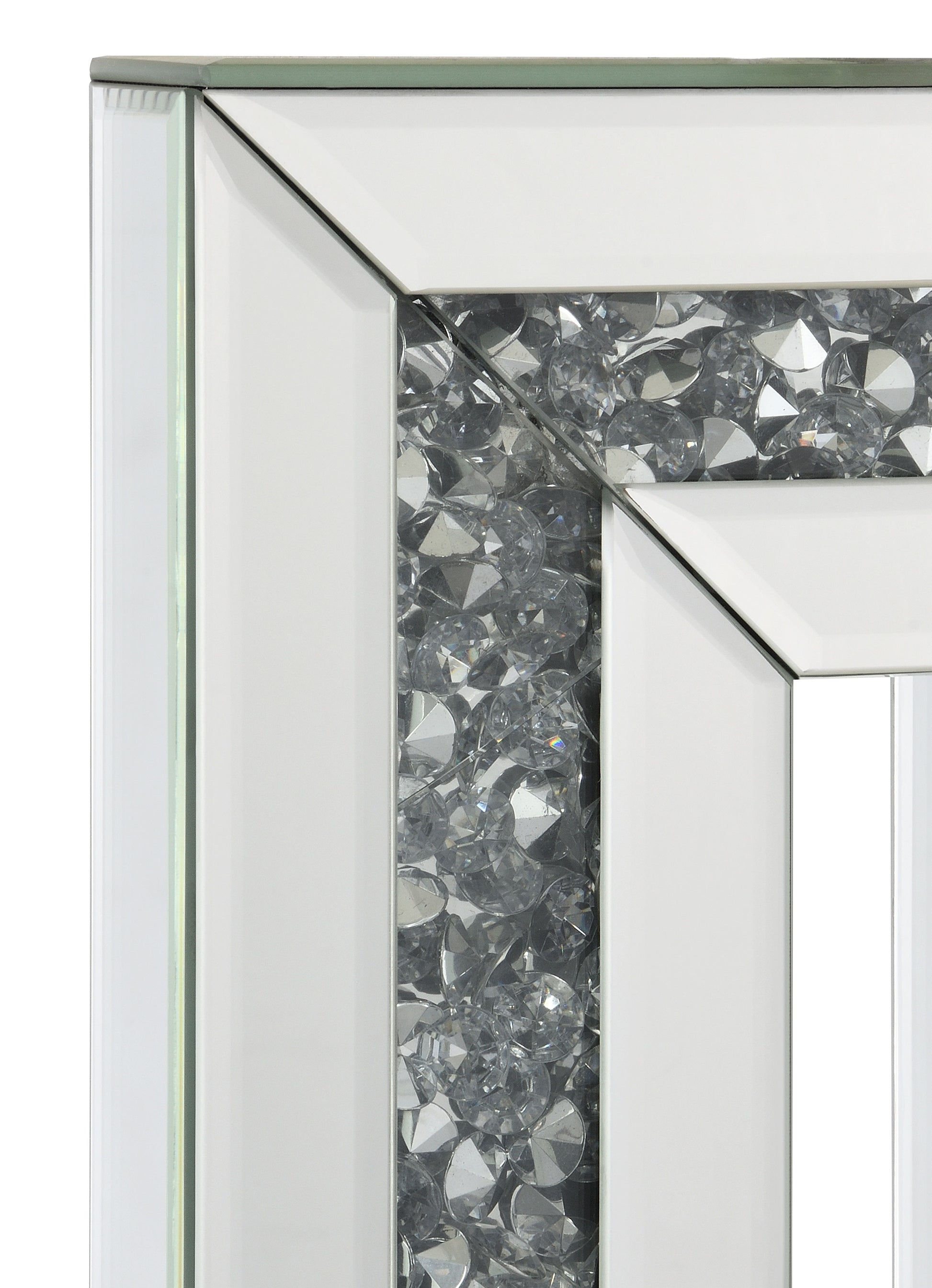 Glimmering dark crystal-like accents emerge from the base interior of this stunning contemporary table lamp. A narrow base outlined in mirror tile accents the edges, creating a beveled look. Mirror tiles also line the flush base, further lending to the reflective, polished nature of the lighting piece. Surrounding the bulb is a square shade wrapped in a white fabric to create a soothing, diffused glow. A transparent acrylic finial tops it all off for one last luxe touch.