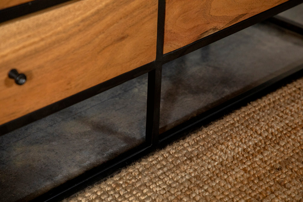 Add warmth to your living area with this natural acacia etagere. Four spacious shelves are perfect for displaying house plants and decor. The bold black frame contrasts with the shelves and provides a rustic touch. Four bottom drawers offer a space to store small items. This piece is supported on a black geometric base.