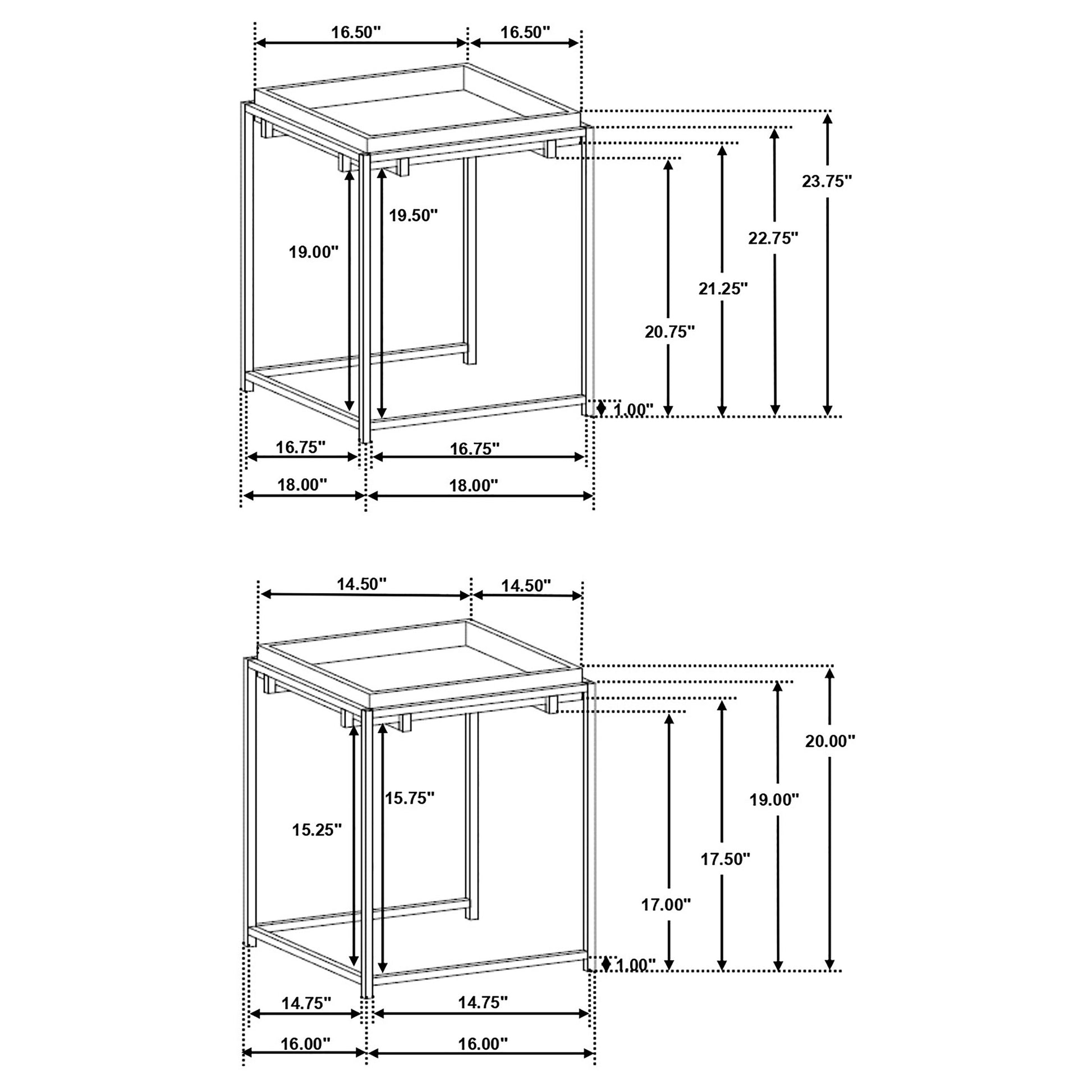 - Retro-style two-piece set of nesting tables with gold finish iron open framing and tray-like tops