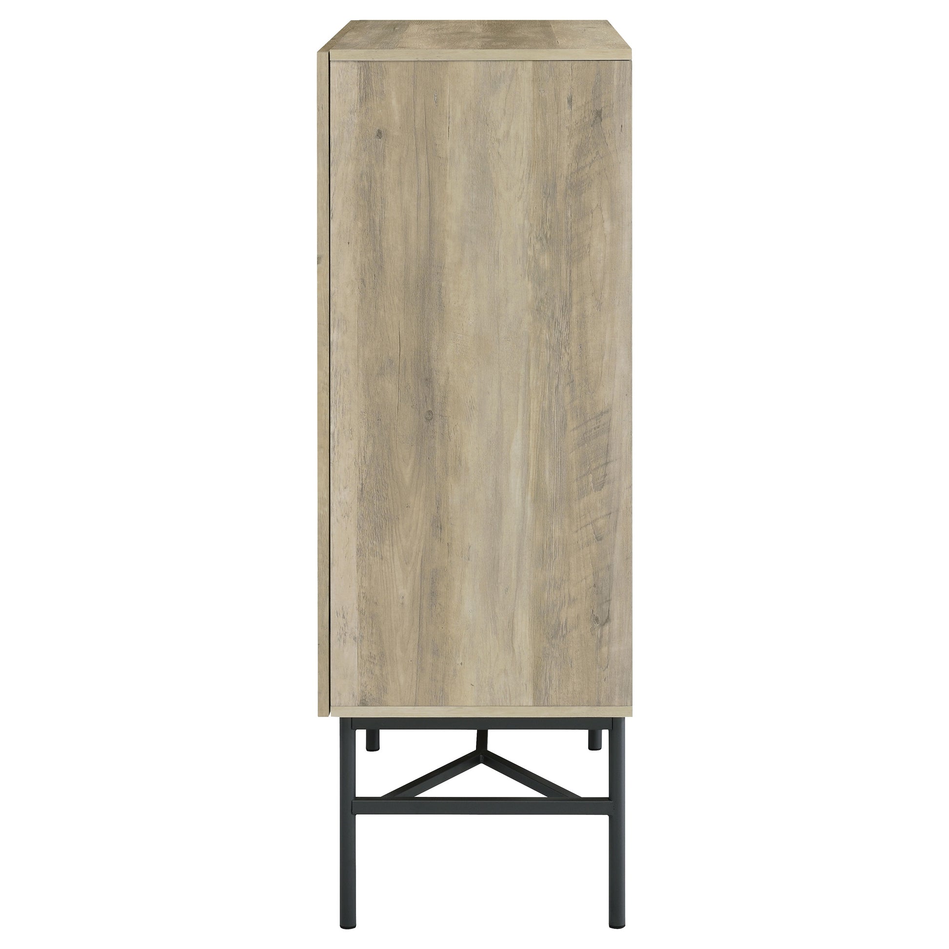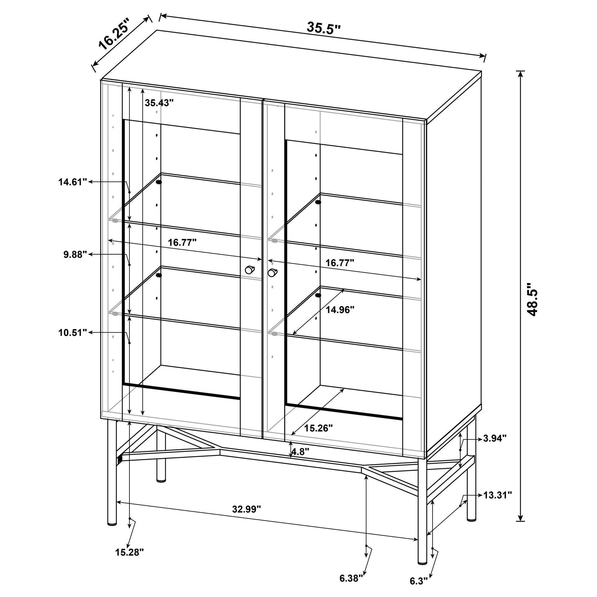 Showcase decor, a book collection and more inside this contemporary accent cabinet. Supported by slender metal legs and a trestle support in a gunmetal finish, this accent cabinet lends an industrial flair to a space. With rustic wood grain finishes covering the cabinet above, this accent furniture piece also makes a stunning addition to a variety of home styles. Tucked behind dual glass doors are four adjustable glass shelves, lending a chic and effortless look. Attached to each of the two cabinet doors is gunmetal metal hardware, reflecting the black base.