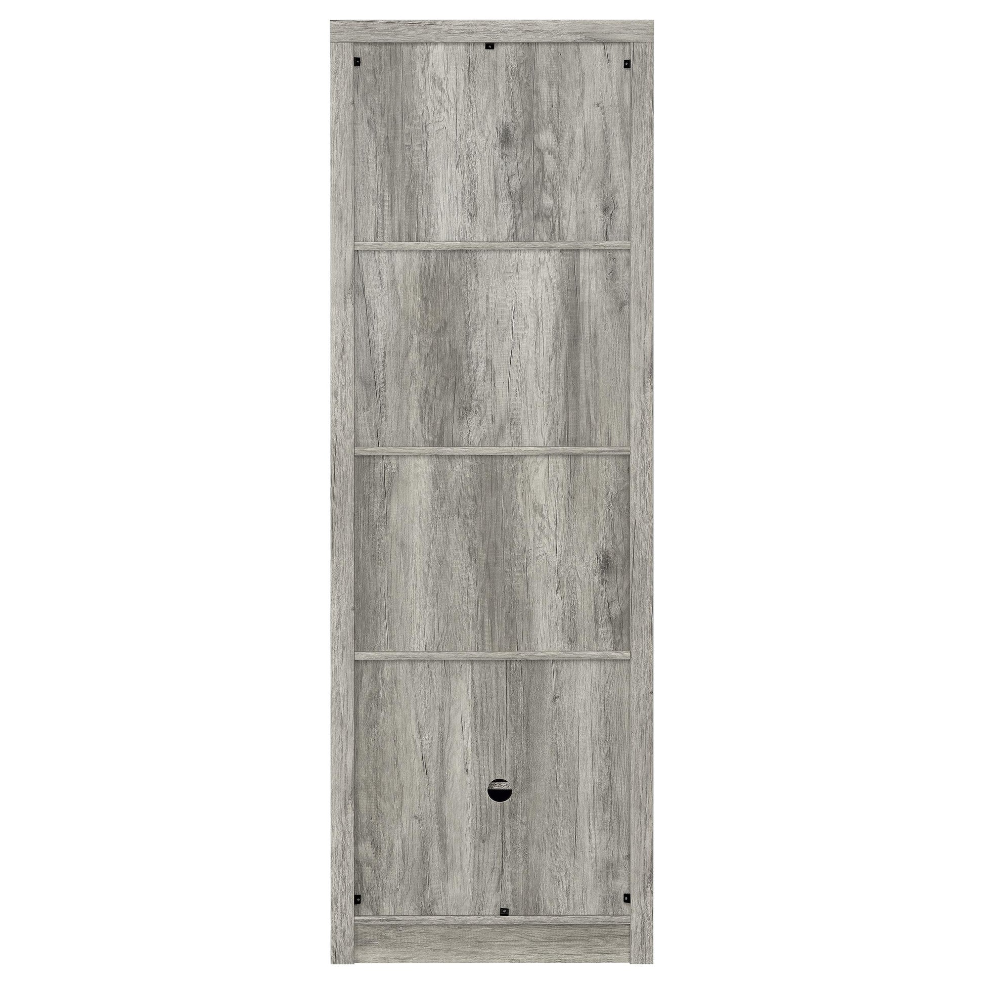 Tall and slender, this modern media tower is the perfect complement for your entertaining needs in both compact and larger spaces. Organize media, books, and implements on shelves and interior shelves, staying organized and uncluttered. Melamine construction features a distressed weathered gray finish with grain-like markings, offering rustic vibes. Find space on three fixed shelves and one adjustable shelf, all ready to separate and store gaming supplies, media, or books. A single black finished metal hardware pull offers an ideal match.