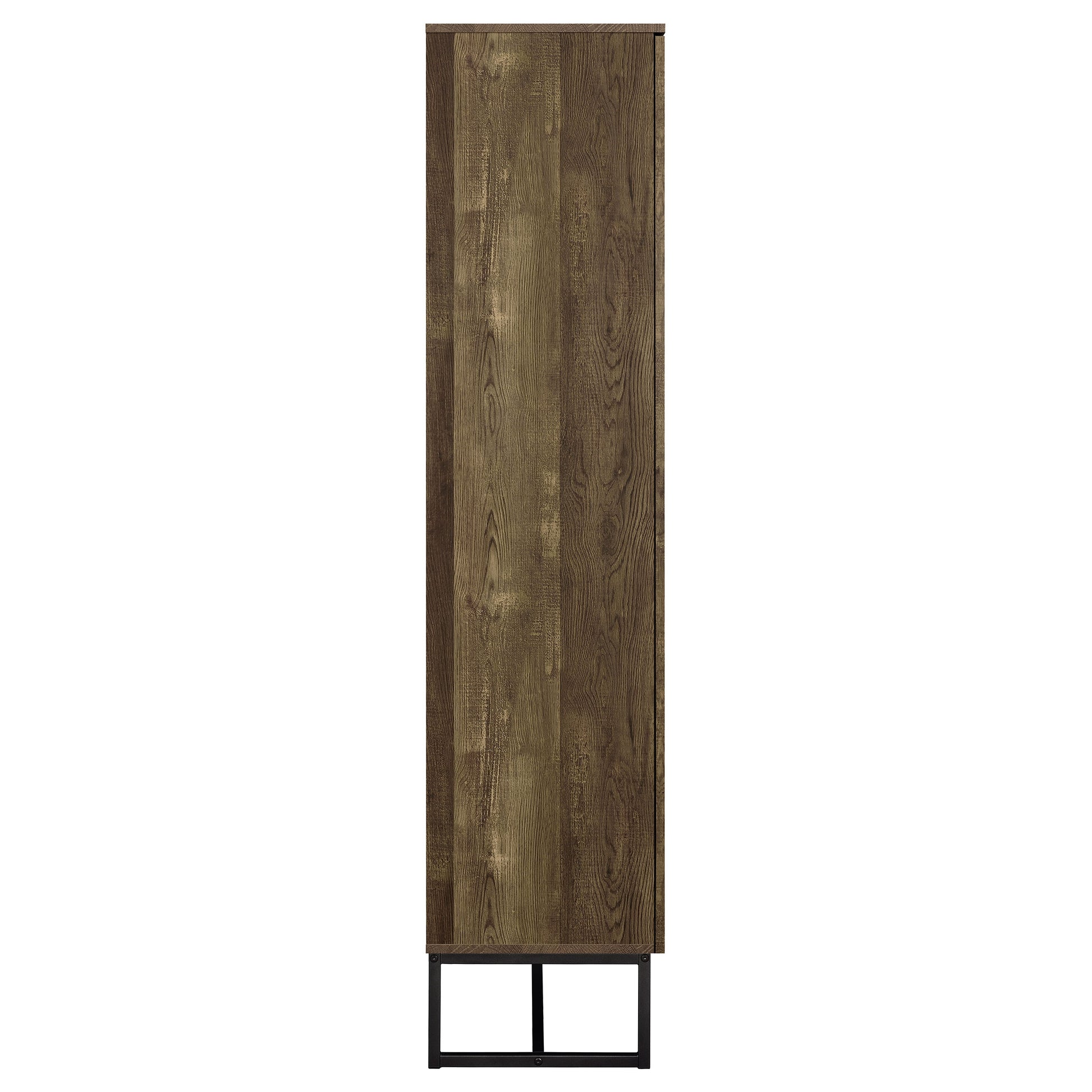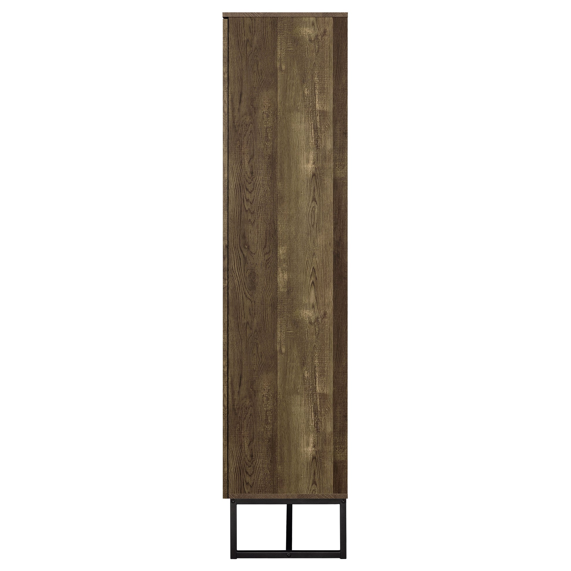 Covered in a rustic oak finish with a weathered herringbone pattern across the front, this tall, contemporary accent cabinet lends itself perfectly to a modern farmhouse living room, home office and more. Place it in a rustic-inspired dining room to hold platters and bowls or a living room to keep media like books and board games. Mounted on an open, slim heavy gauge steel base in a dark gunmetal finish, this handsome accent cabinet offers plenty of storage space inside. Tucked behind tall cabinet doors are six interior shelves for neatly organizing all your essentials. Mounted on each cabinet door are gunmetal finish square knobs as well.