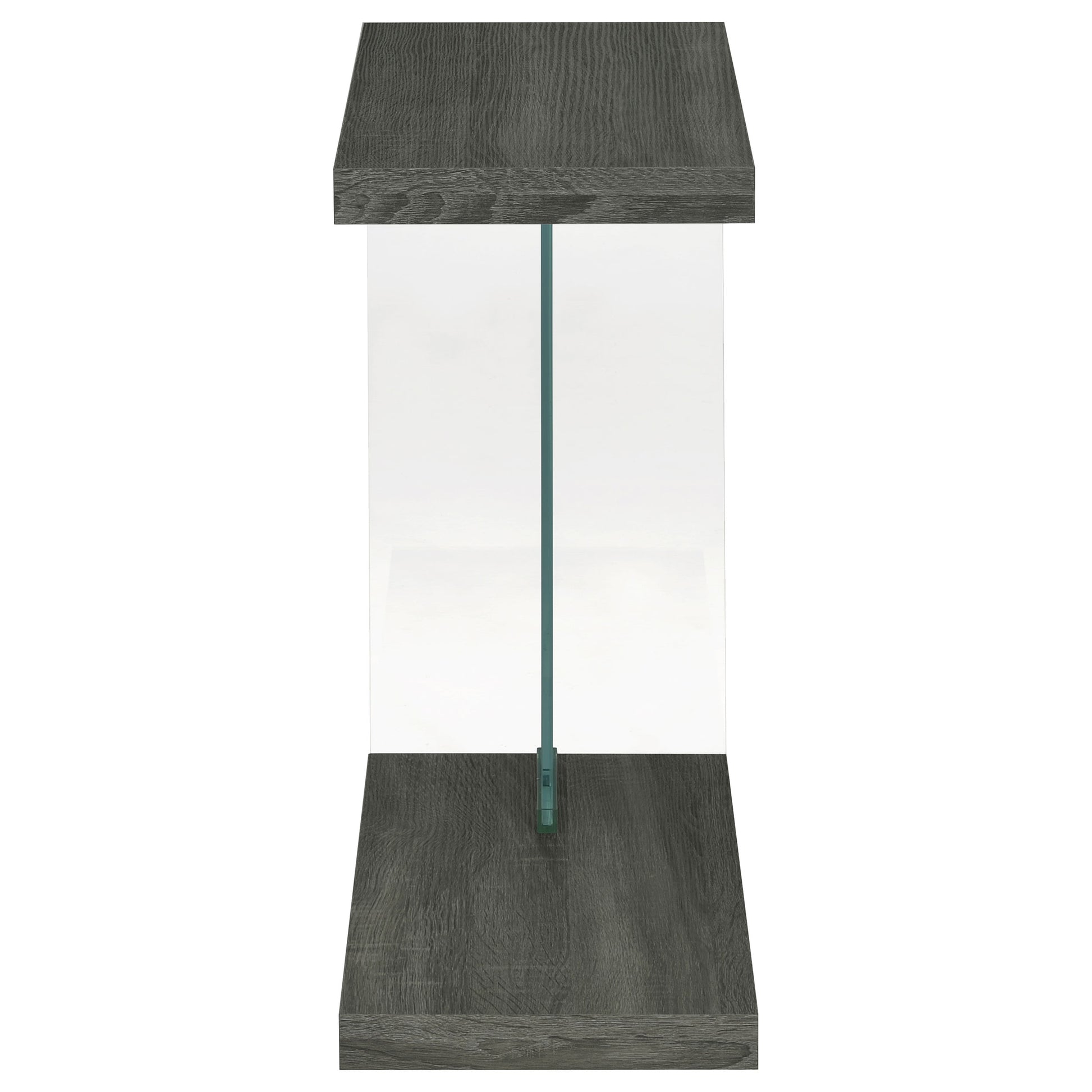 Add subtle elegance and maximum functionality to a living room with this weathered grey accent table. Also available in black and grey, this table is balanced with a dark top and base. Featuring a sideways U-shaped silhouette, the open frame easily slides in next to a sofa or chair for versatile functions. Enjoy your morning coffee or check your e-mails leisurely with the elongated rectangular top. The contrast between the clear side, shiny metallic, and warm wood transforms spaces.