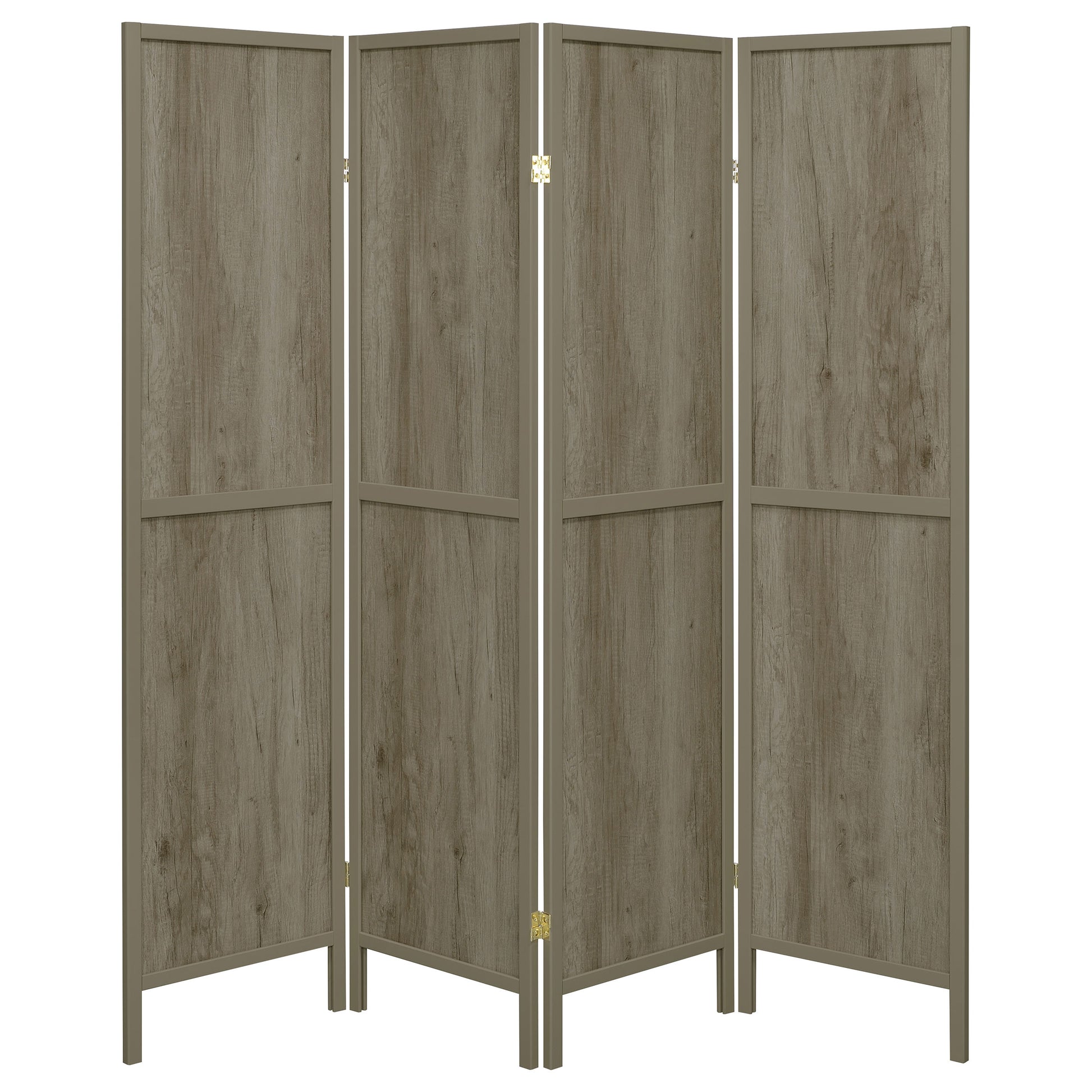 Cast a soft glow throughout a classic space with this four-panel screen. Variations in hue give the exposed wood grain depth with a grey driftwood finish. Light in color, the sleek legs mirror the wood finish to complement and add structure. The panels create a modern aura in any shared space with their soft coloring and clean silhouette. Connecting the panels is hardware that adds a pop of warmth.