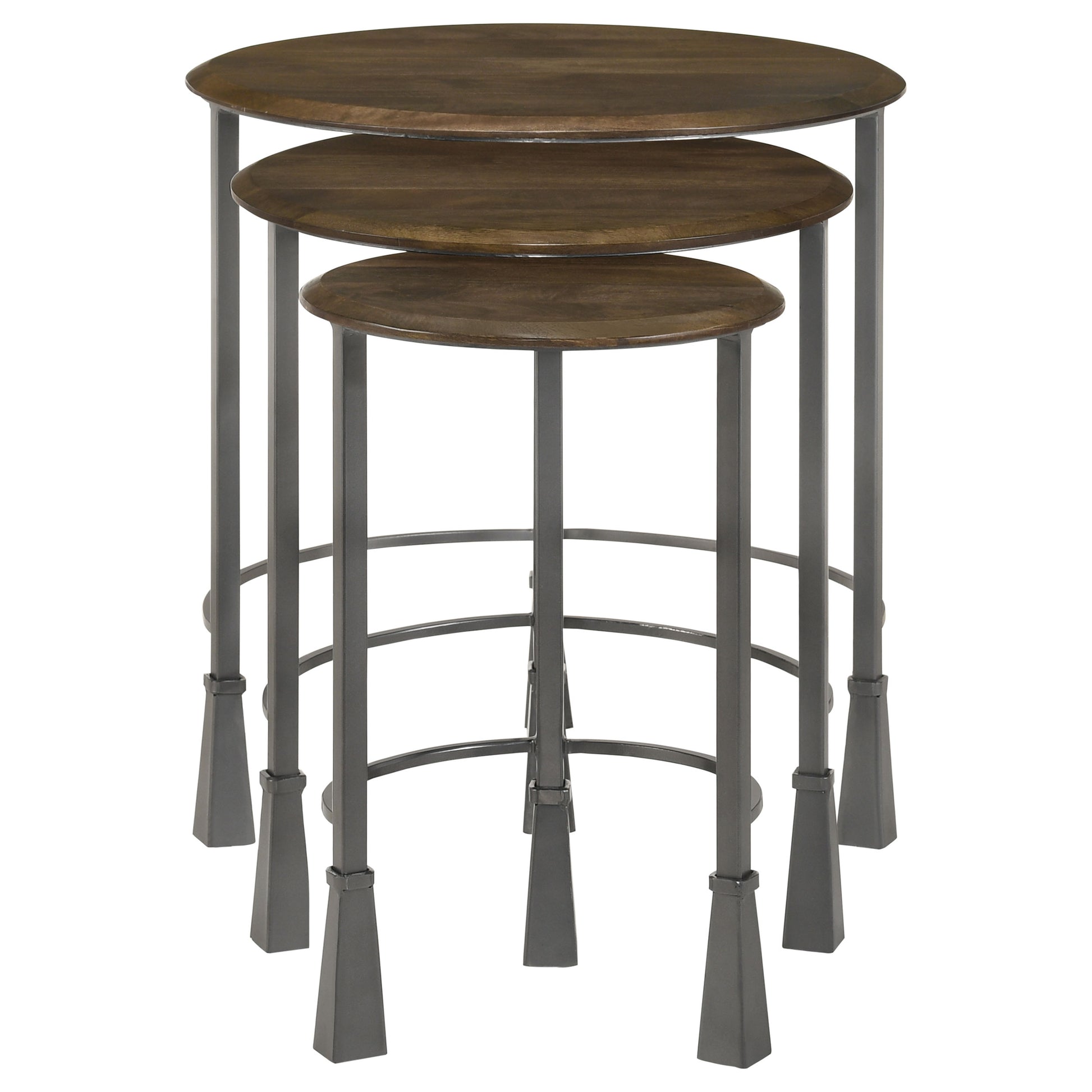 Modern shapes and mixed materials elevate this set of three nesting tables. Designed with natural round tabletops made of eco-friendly mango wood, and situated on gunmetal finish iron legs, this industrial nesting table set is perfect for sustainable homes and lifestyles. Each table features slim tubular legs that extend to the floor with conical flared feet and offer an additional circular brace that mirrors the tabletop. Place this nesting table set in a modern farmhouse home where space is limited. Keep an accent lamp and essentials on the largest nesting table and slide the smaller tables out to serve guests.