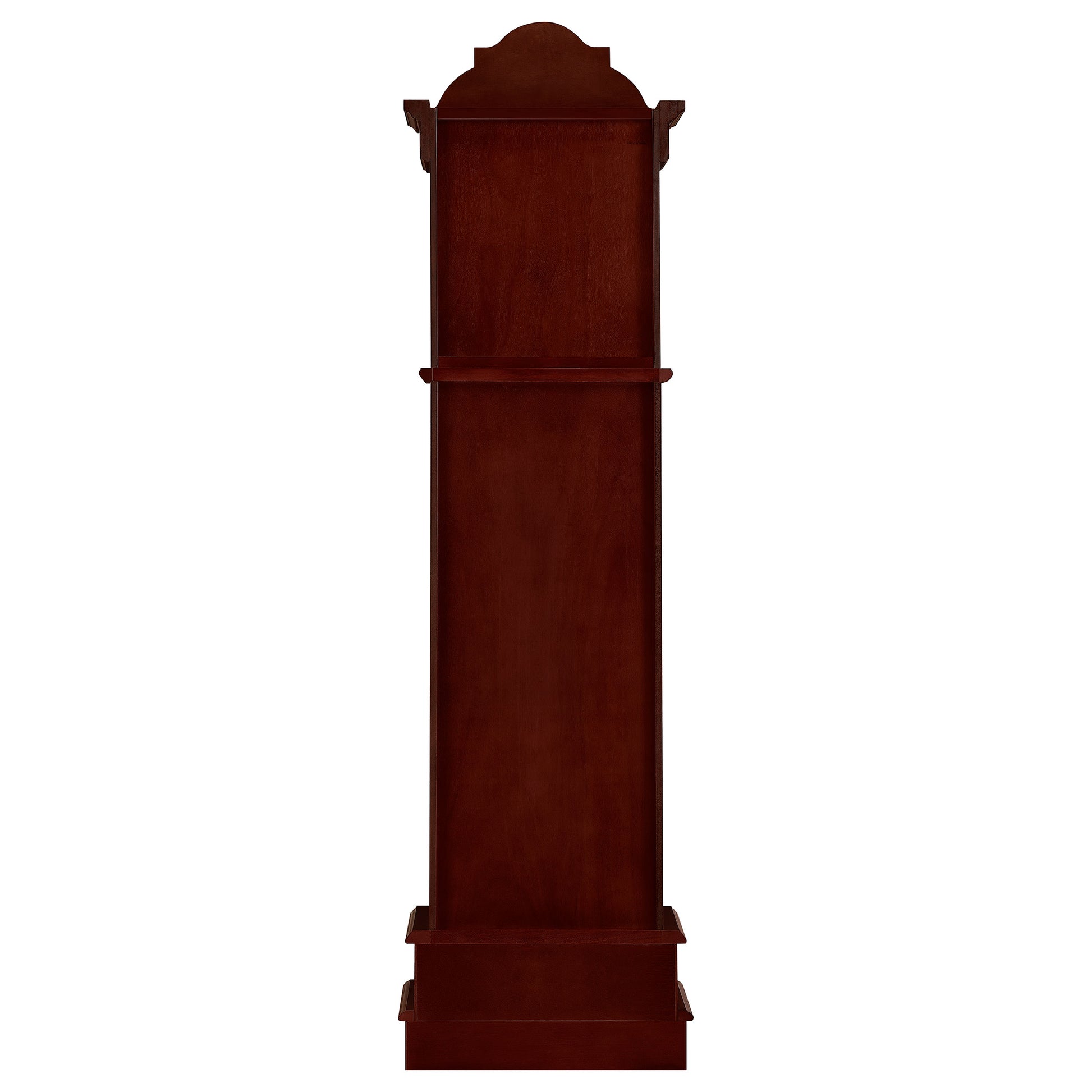 - Traditional grandfather clock in brown red finish with gold details and pink felt interior