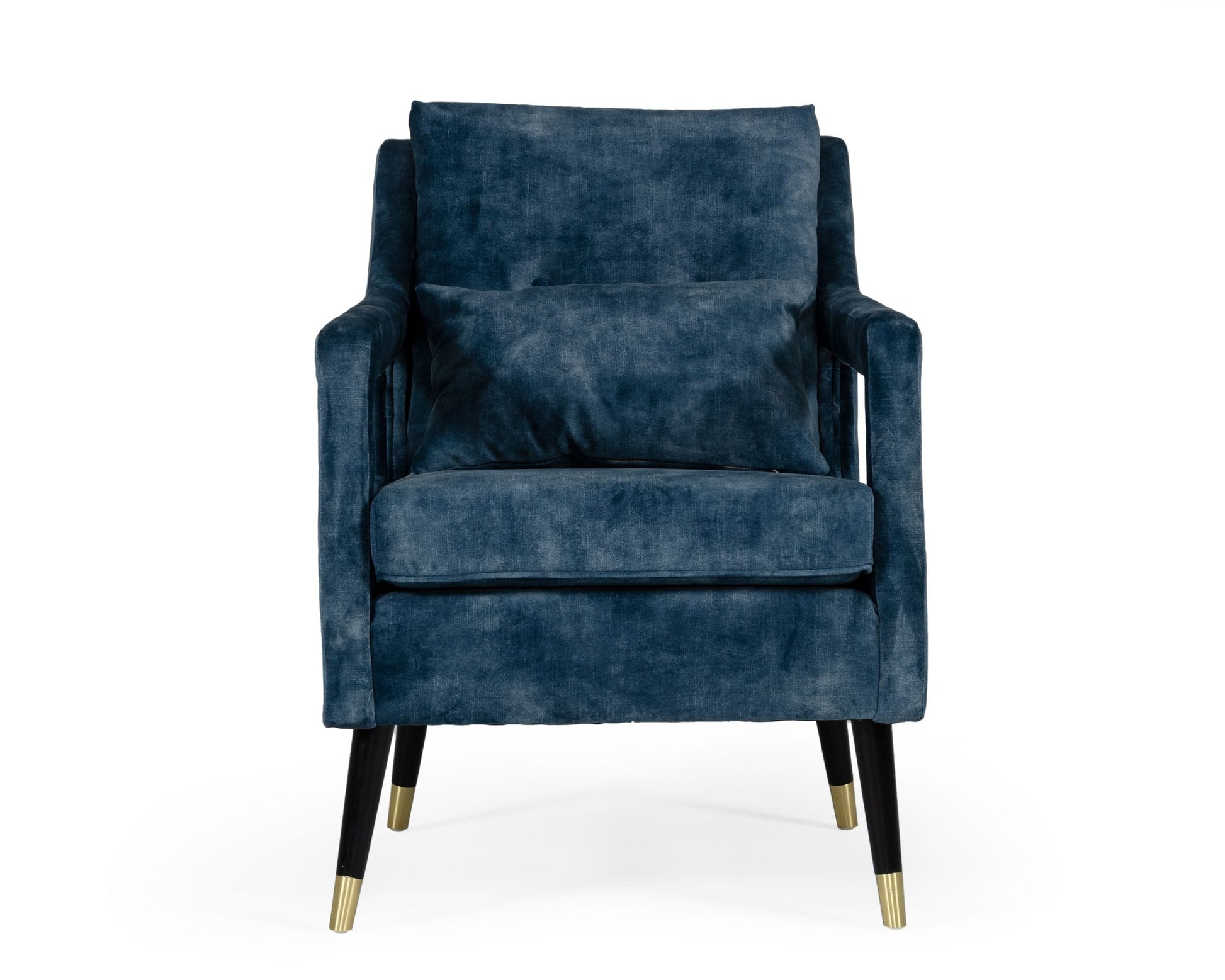 This mid-century blue velvet accent chair features soft, velvet upholstery with a tufted back cushion. This chair features a removable seat and back cushions, as well as removable cushion covers, which are filled with comfortable foam. There's also one throw pillow included. The solid black chair legs feature gold tapered tips, which add another element of style.
