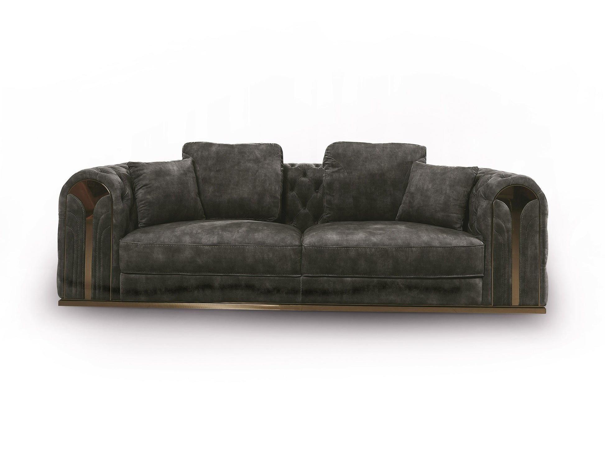 The Divani Casa Dosie Transitional Grey Velvet Sofa Set is a sophisticated ensemble that combines comfort and elegance. Upholstered in a luxurious grey velvet fabric, this set includes a sofa, loveseat, and chair. The gold stainless steel legs and accents add a touch of opulence, while the button-tufted arms and back provide a classic look. With five throw pillows included, this set is perfect for lounging. The eucalyptus wood frame, foam upholstery fill, and sinuous springs seat construction ensure durability and comfort. Whether for entertaining or relaxation, this sofa set exudes timeless charm and style.