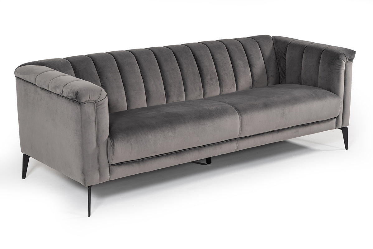 Beautifully crafted, the Divani Casa Jeremy Modern Grey Velvet Sofa has a solid wood frame. It features high-density foam cushions upholstered in charming grey velvet fabric so you can lean back and relax. The channel tufts on the front of the back and the arms that are aligned at the same level added to the convenience of this sofa. Sturdy support from angled metal legs and a tubular shape leg in the middle keep this sofa steady. Requiring some assembly, this modern grey velvet sofa elevates the welcoming ambiance of your living room and is equally useful for a home office, a sitting room, and the bedroom.