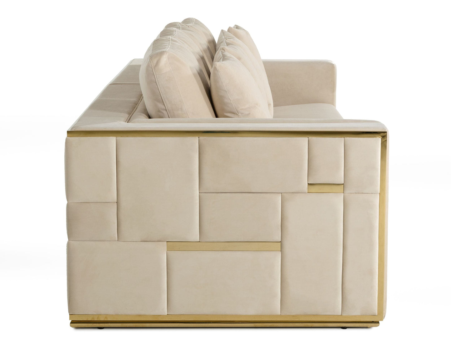 The modern silhouette of the Mobray Sofa becomes a stand-out item with its lovely gold accents. The beige velvet upholstery is luxurious and neutral, matching everything in your home. The seat cushions and covers are removable, allowing this item to be easily cleaned. The back of the sofa is padded with 8 foam-filled pillows. This glam sofa is perfect for any modern living area.