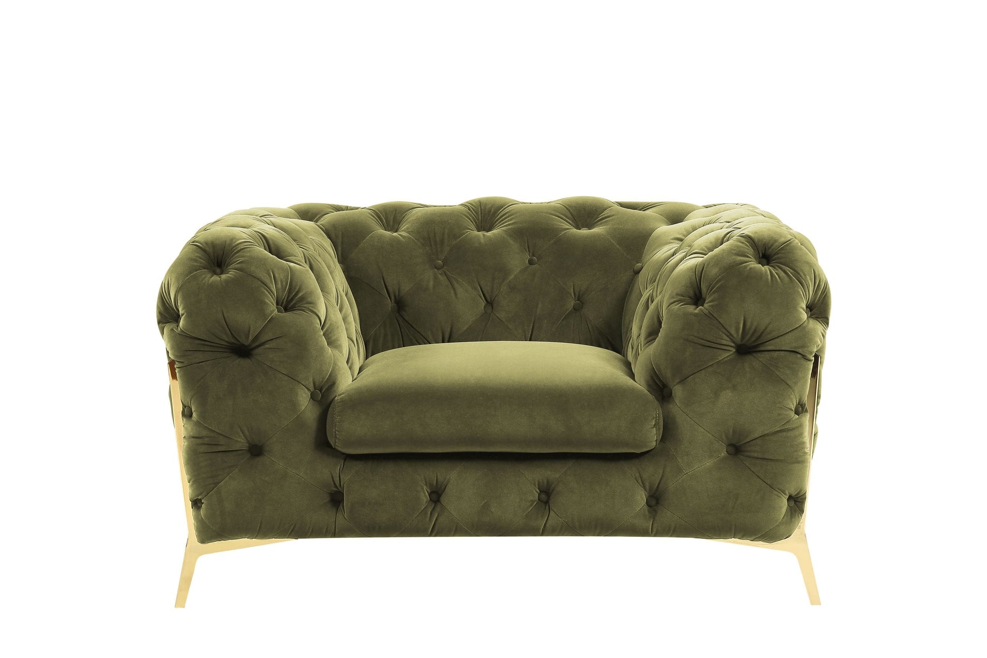 The Sheila Green Chair is a beautiful transitional, glam piece that can be used in different design settings; glam, transitional and contemporary. The chair is upholstered in green velvet fabric, with overstuffed back and arms in a tuxedo style with diamond button tufting, and polished gold legs that extend upward creating a design feature of their own. Pair with the three seater sofa, and two seater loveseat.