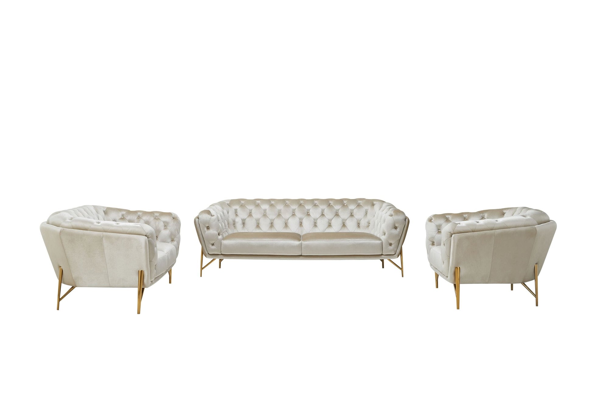 The Stella Sofa Set is an ideal glam set for your living space. The diamond tufted beige velvet upholstery compliments beautifully with the exposed beige stitching. The gold metal tapered legs create a dramatic silhouette against the velvet. upholstered buttons finish the tufting while the plush seat sits inside a slim layer. An ideal solution to your contemporary glam style space.