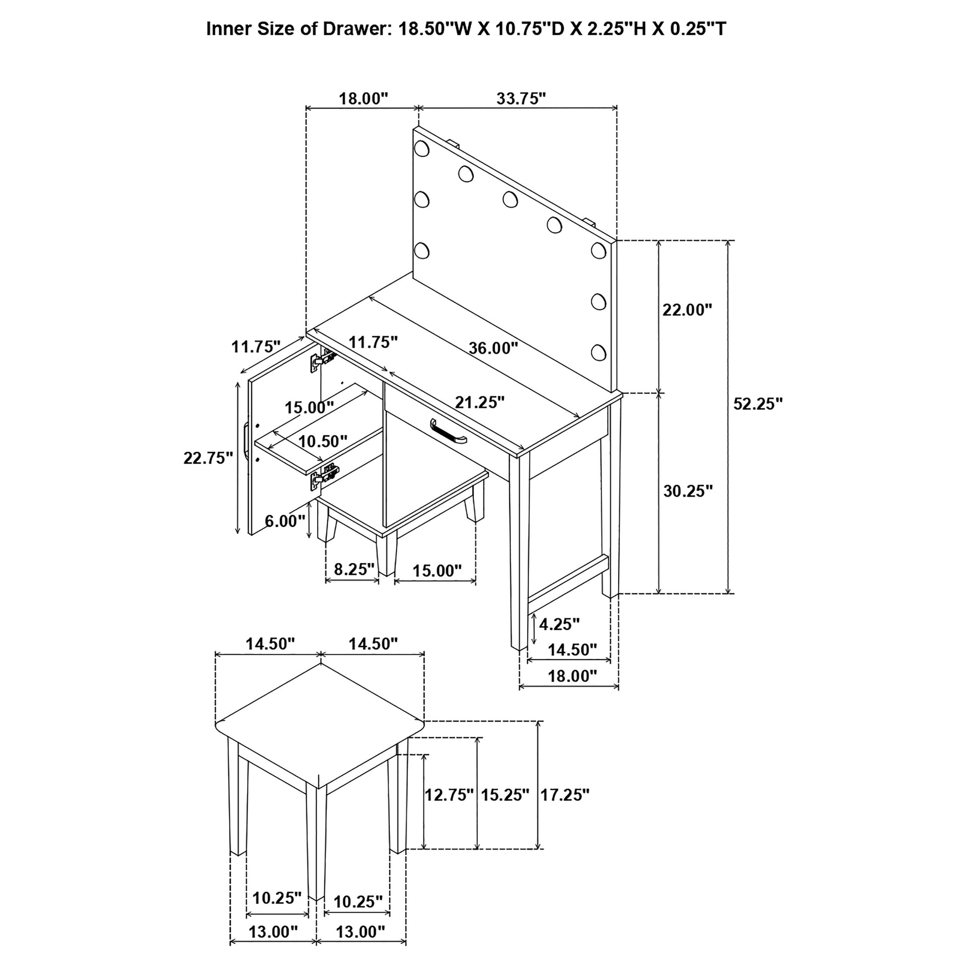 - Includes: One (1) vanity table, one (1) mirror, and one (1) stool