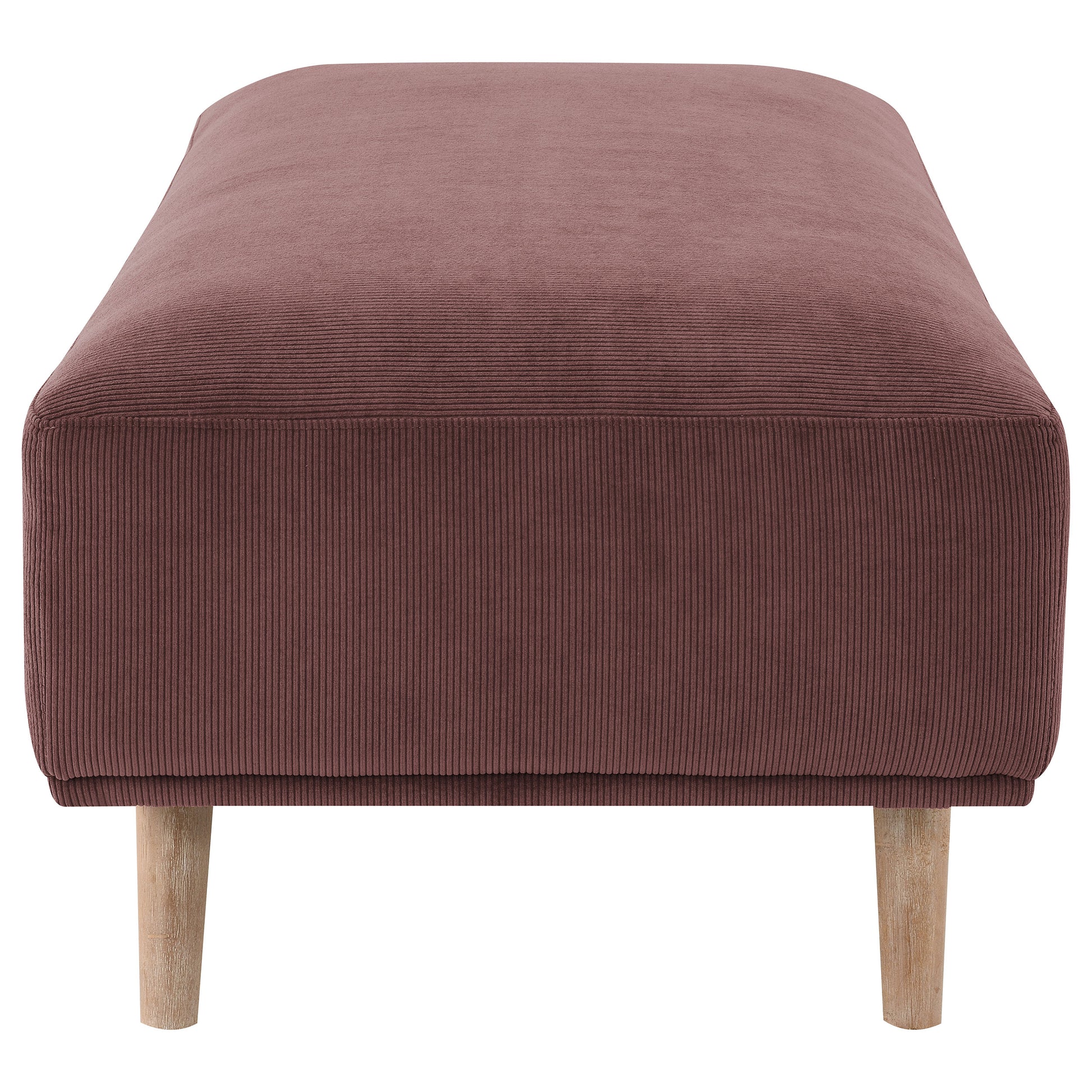 Complete your inviting sitting area with the richness of a modern ottoman. It showcases red wine upholstery, adding depth and the richness of a lovely jewel tone to your living room. It features a rectangular silhouette with plush padding, offering a footrest, seat, or tabletop. The upholstery is trimmed at the base, adding tailored flair. The ottoman is complete with tapered, splayed wooden legs with a light finish that adds contrast and depth.