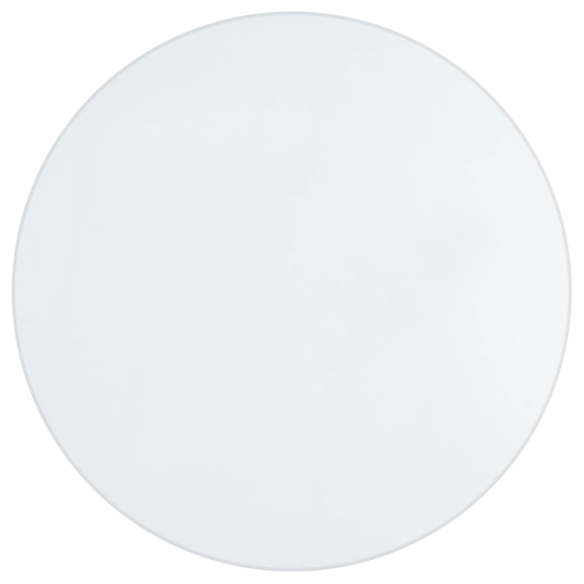 - Round clear glass tabletop and column-like pedestal base offers an open, airy feel