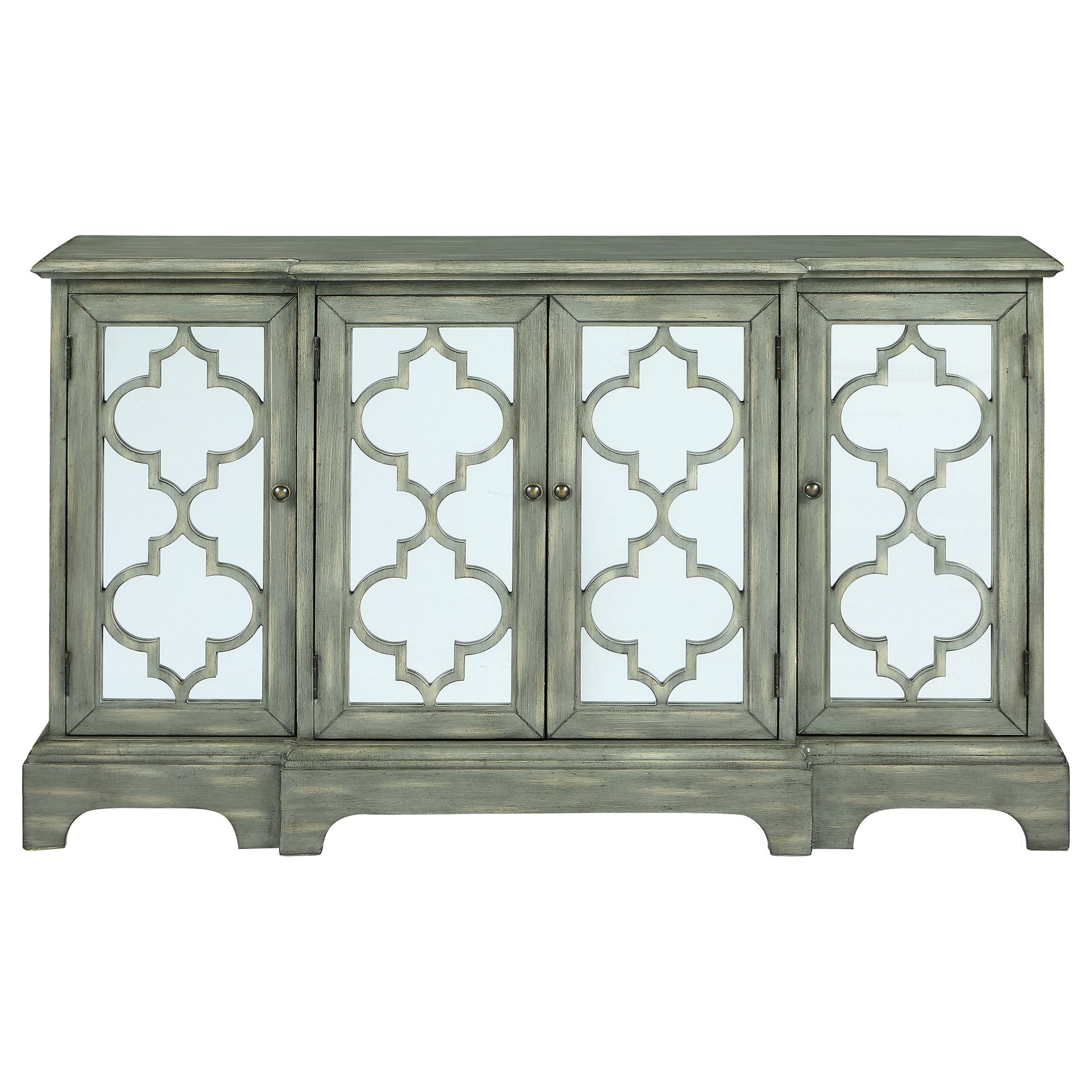 Complete a living or dining room with the decorative pattern on the front of this modern accent cabinet. The legs and geometric shapes dazzle in a weathered grey finish. Subtle hue variations and an exposed wood grain marry to add depth. An upgrade to the classic sideboard, this cabinet features clean, contemporary lines on its silhouette and legs. Store extra dinnerware or linens while displaying a decorative vase or family pictures.