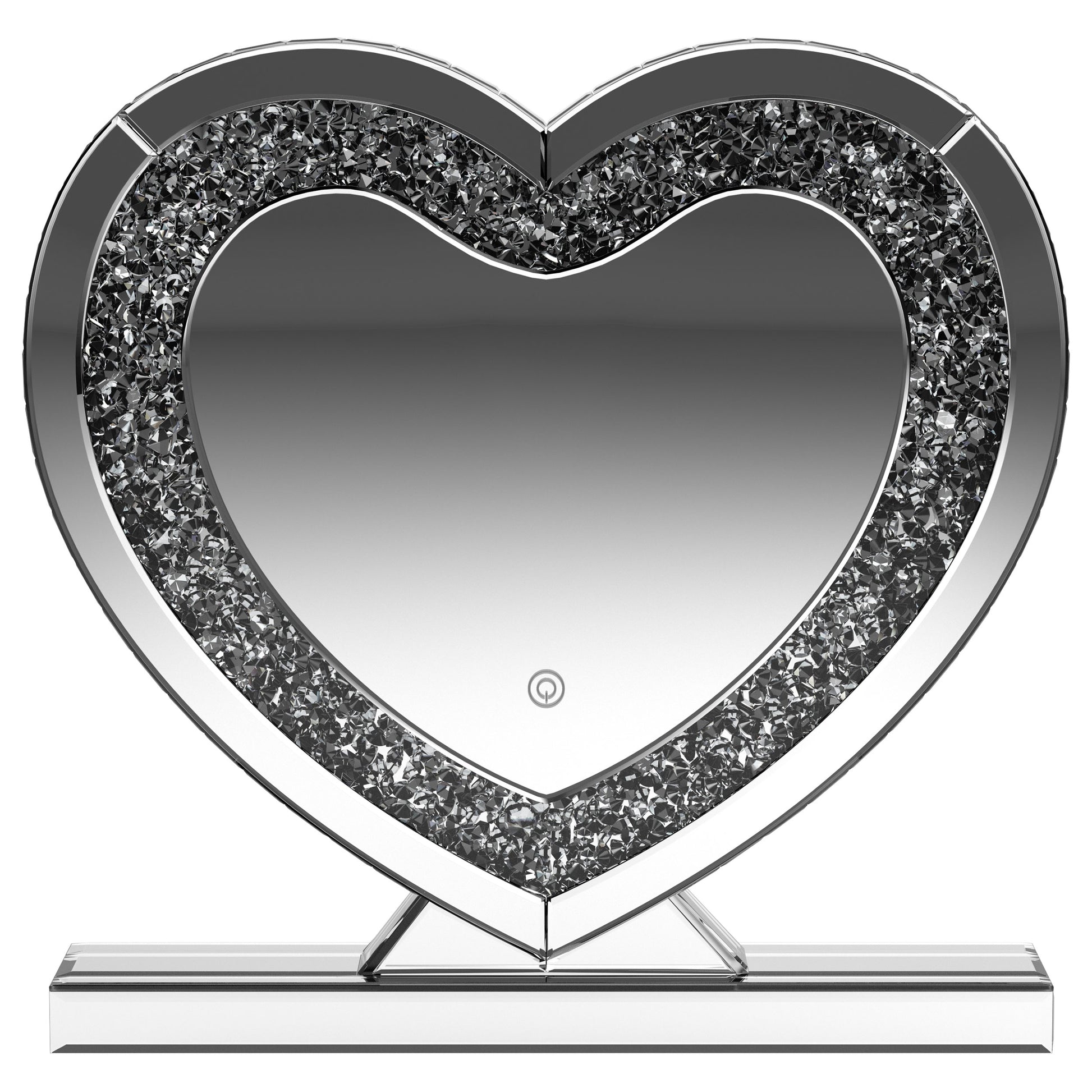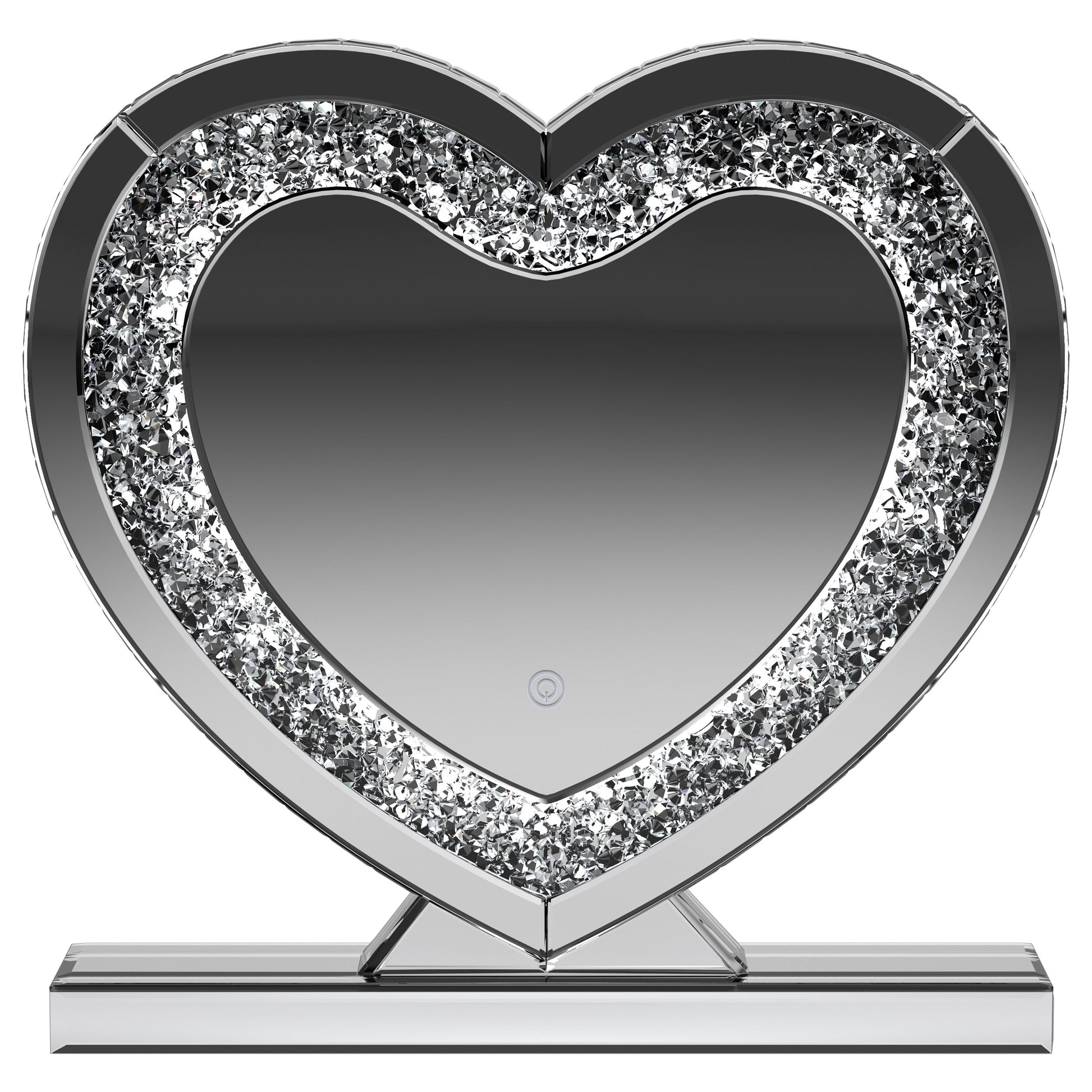 Draw attention to a heart motif with this whimsical table mirror. The heart shape mirror features a silver frame and stand for displaying on a table or shelf. This accent mirror provides sculptural depth when displayed on a bookcase along with other keepsakes. The clear mirrored surface adds a dimensional element that draws the eye. This contemporary mirror could also serve as an artsy accent on a dresser or nightstand.