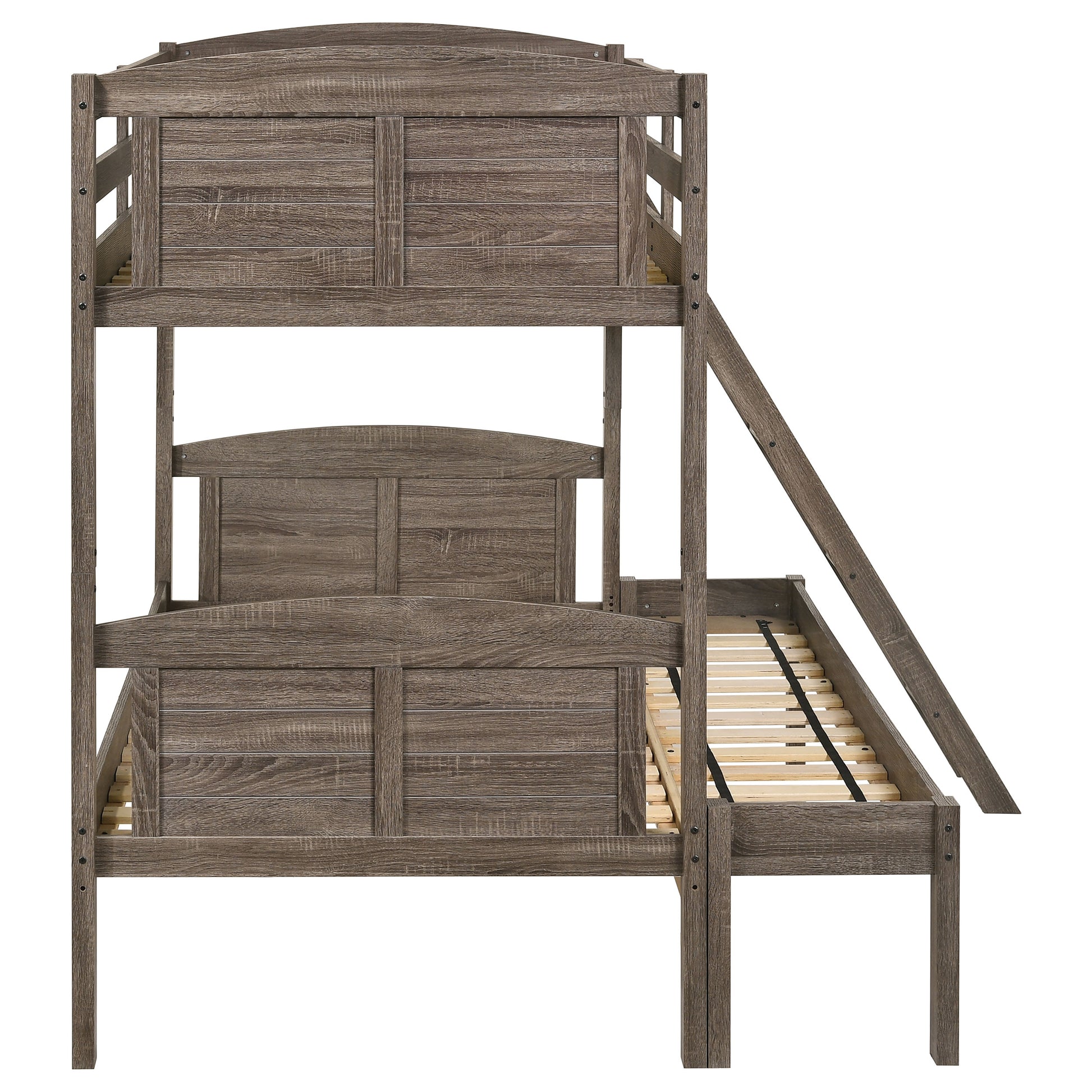 A casual country vibe carries the space with this rustic bunk bed, perfect for compact bedrooms and shared sibling spaces. A weathered brown finish lends a neutral hue to transform a space into a serene, restful retreat. Along the top bunk are safety guardrails to keep younger ones secure as they sleep soundly through the night, complete with a built-in ladder for climbing up. The arched headboard and footboard offer grace and style, along with the plank paneling as the bottom bunk invites baskets, bins and more to organize personal items. Last but not least, this versatile bunk bed can be separated to create individual beds when siblings wish for their own space.