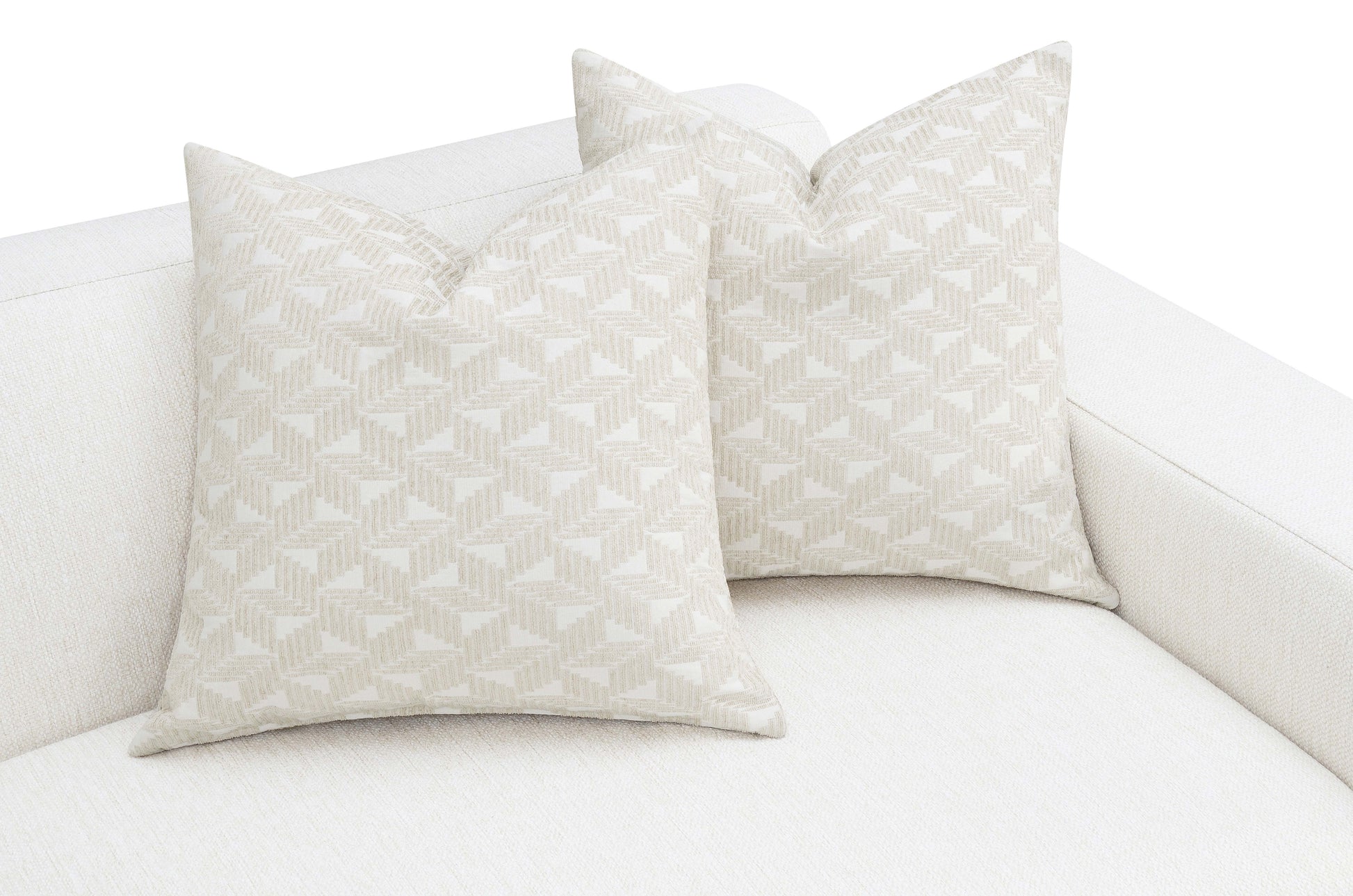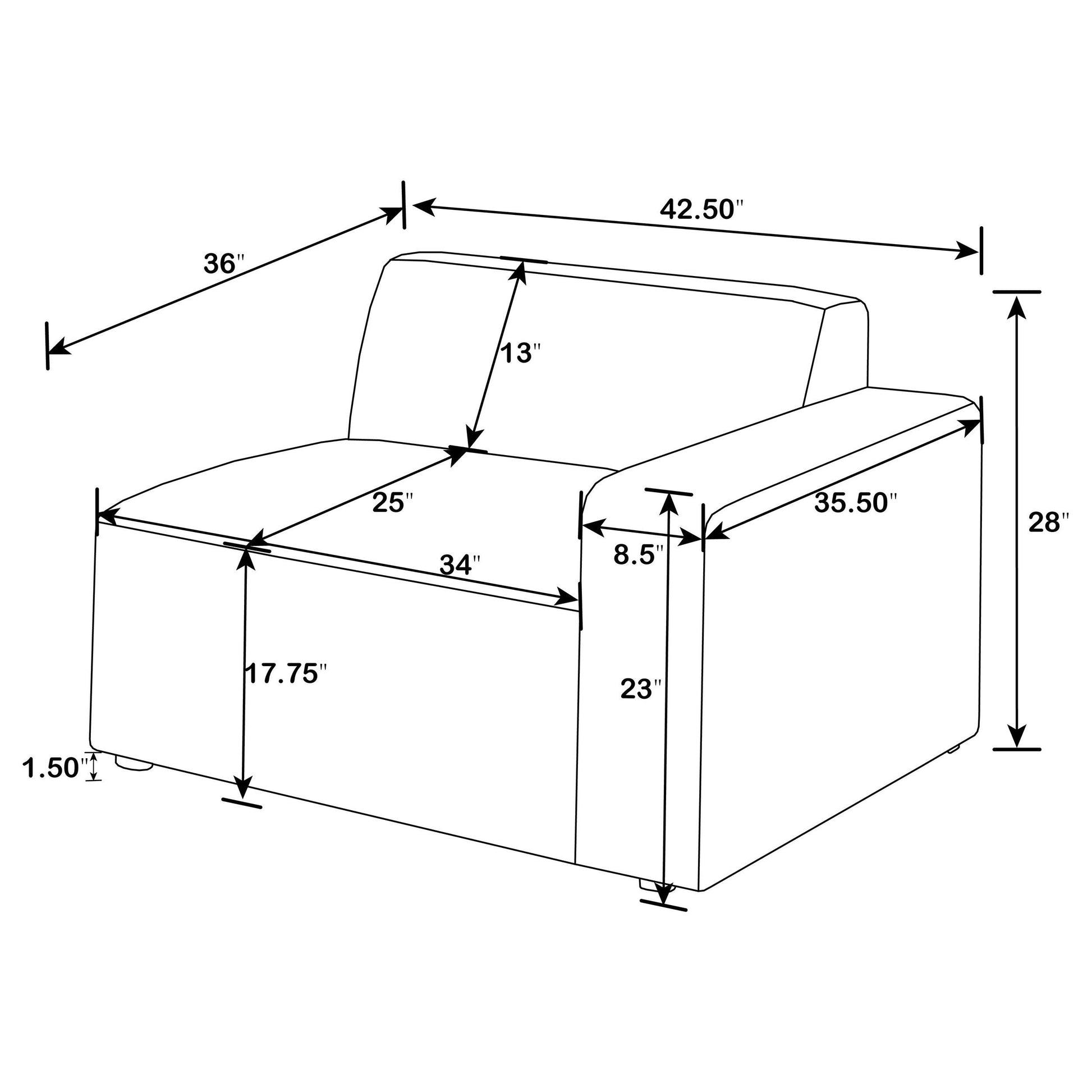 Create the perfect modular sectional set up in your living room with this modern right arm facing chair, upholstered in a bright and soft pearl performance fabric across a foam padded pocket coil seat, sloped low-profile backrest and straight wide track arm. Hidden below the thick cushion and waterfall-inspired edge are black round legs that offer a subtle elevation to reveal decorative rugs and offer dimension against floors.
