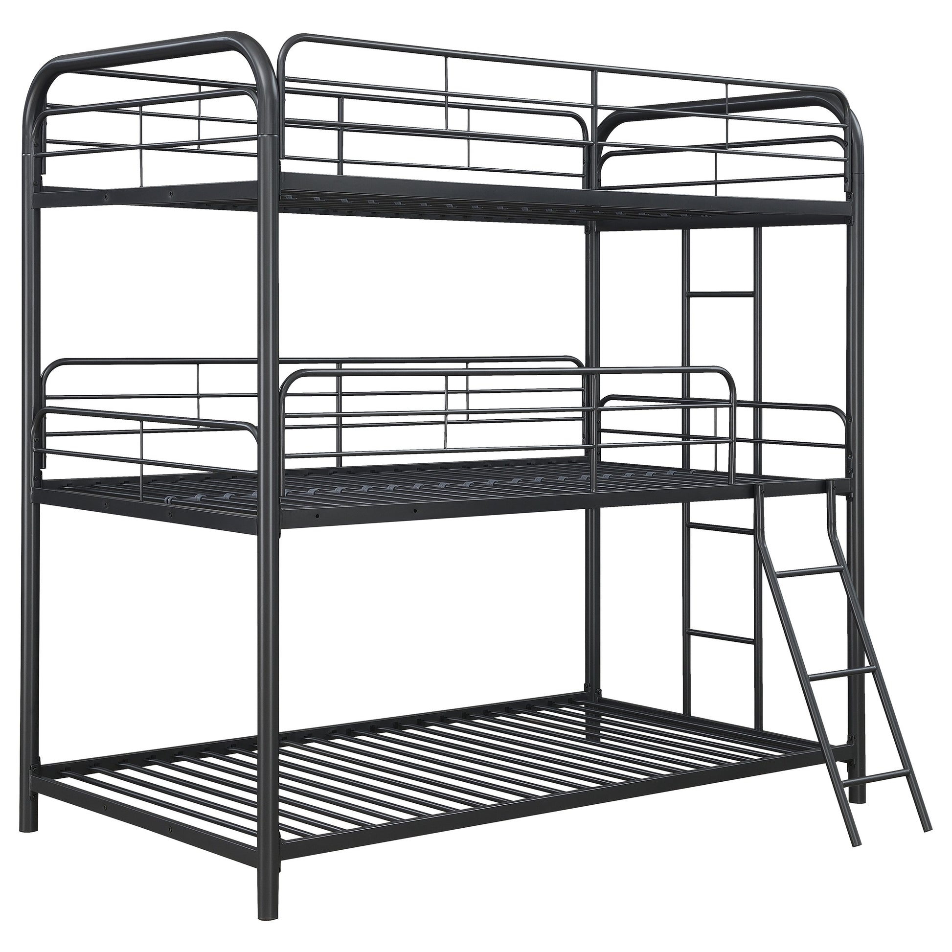 Compact spaces and large families love this triple bunk bed. The modern design is enhanced with clean lines and durable heavy gauge steel construction. Finished in a gunmetal, this stylish triple bunk bed brings function and aesthetics to a youth's bedroom. Find two attached ladders available to access the middle and top bunks. With sturdy guardrails, you will feel peace of mind for the safety of your little ones.