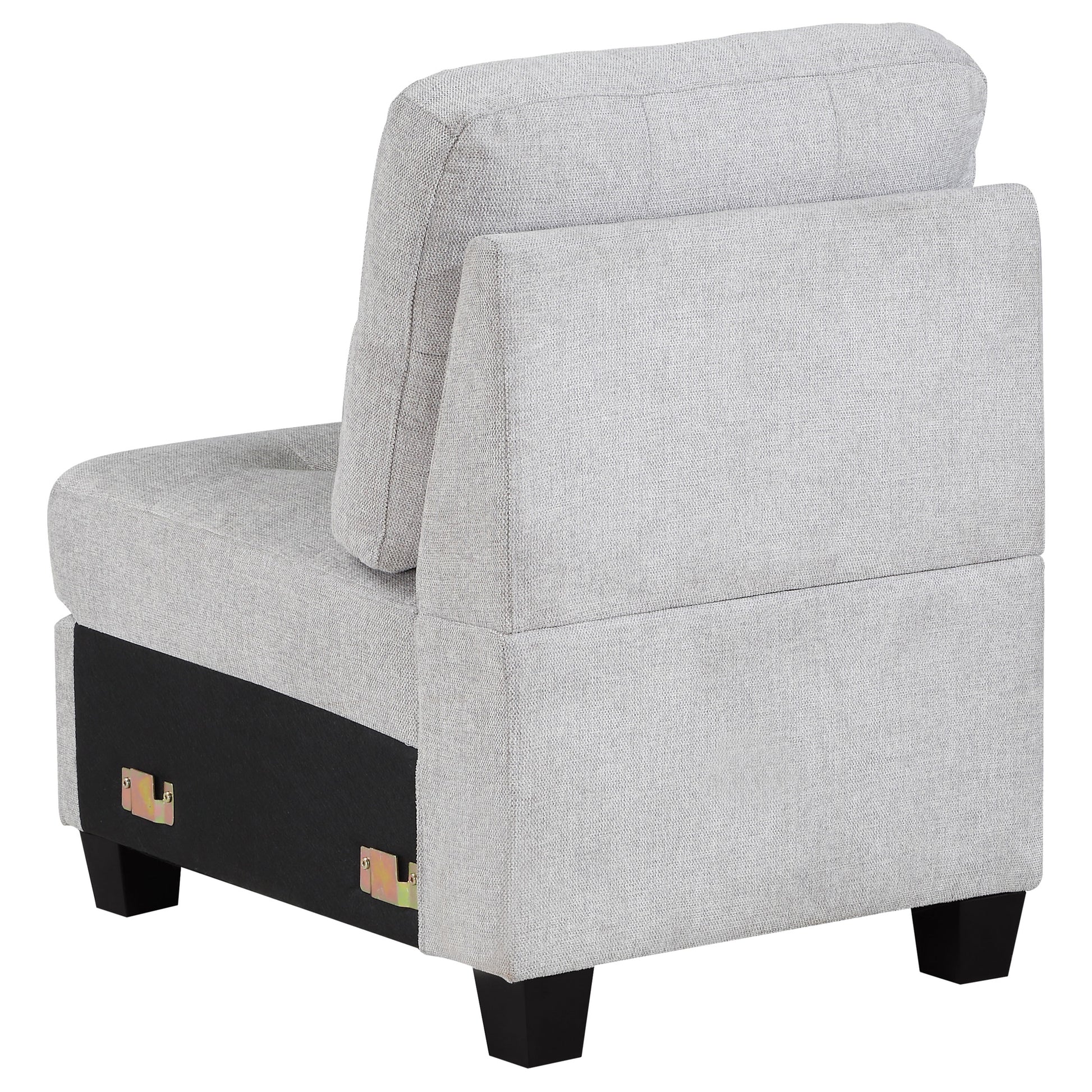 Build the sectional that suits your space with a modern armless chair. In soft beige upholstery, it's the perfect way to extend your Georgina collection sectional sofa, adding length to suit your living room. The chair features tufted cushions and sinuous spring decking under the seat, offering impressive comfort and support. Legs are a black finish tapered block style, complementing surrounding decor while offering stability and support. This sectional piece is constructed with Asian hardwoods and plywood for optimal strength and durability.