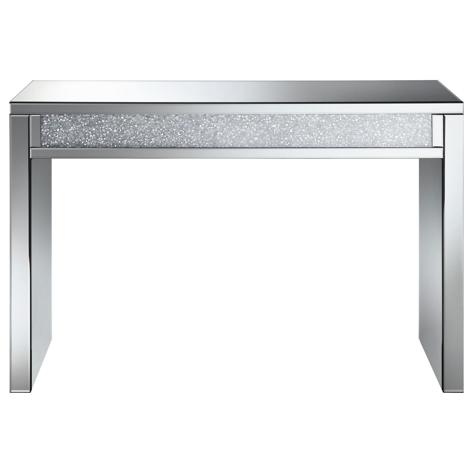 A sofa table is an accent piece that looks good anywhere. This silver sofa table matches well with a modern, contemporary styled sofa finished in black or light grey. It also looks great as a standalone piece topped by a silver-accented lamp or decorative vase. Straight lines offer a fresh, modern appearance. Sides are finished in a unique pattern that is nice contrast to solid silver finish throughout.