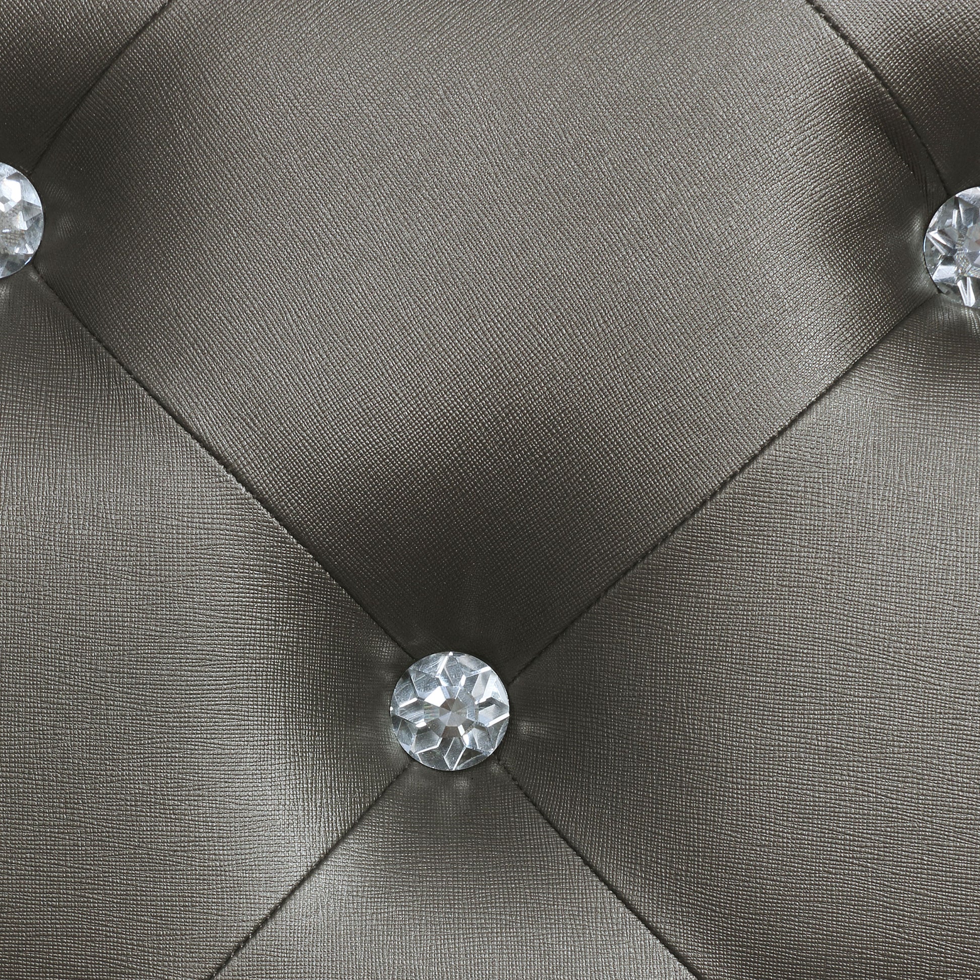 - Bed is upholstered with metallic leatherette, fully tufted with crystal buttons
