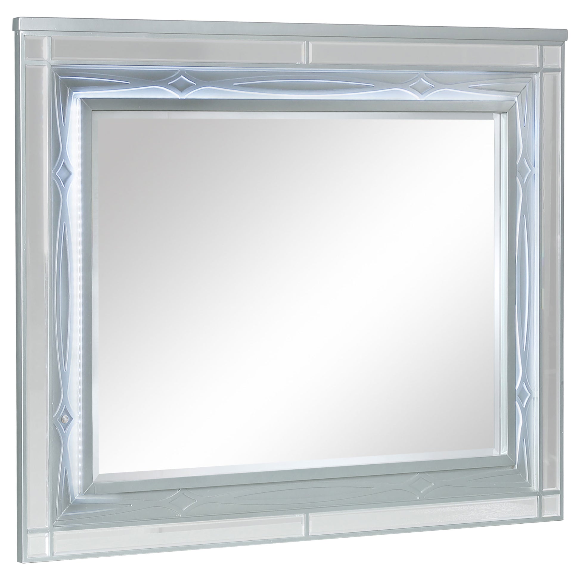 - This glamorous design is accented with antique mirrored frames and a blue LED light on headboard