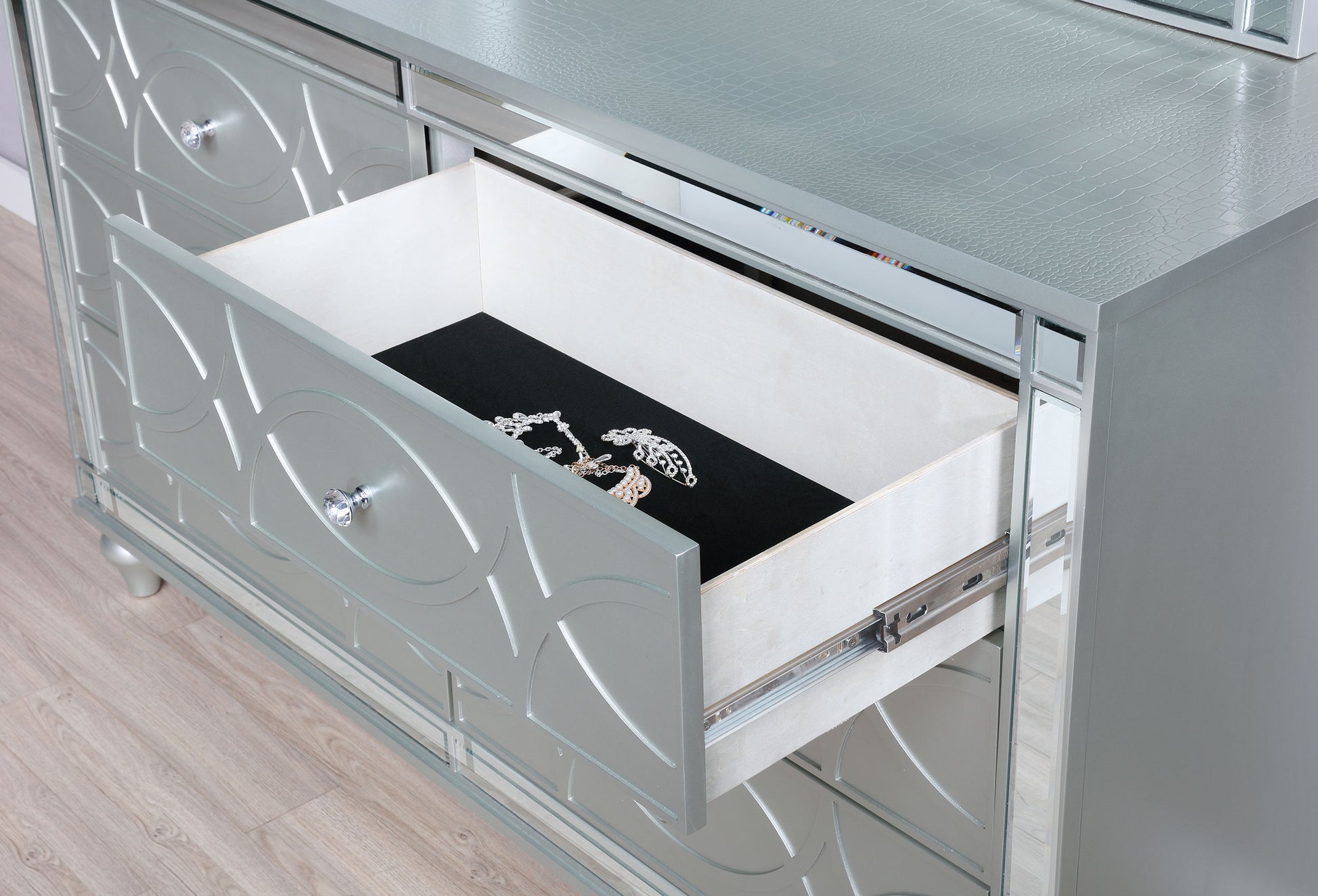 Transform a bedroom into a stylish sanctuary.This stunning, five-piece bedroom set is a truly exquisite choice with its elegant fretwork and dramatic decorative accents.The metallic leatherette headboard flaunts crystal button tufting for a touch of bling.The headboard and mirror are traced with blue LED light for soft ambiance.The nightstand, chest, and dresser feature decorative drawer fronts and provide plenty of storage space for a neat and organized personal space.