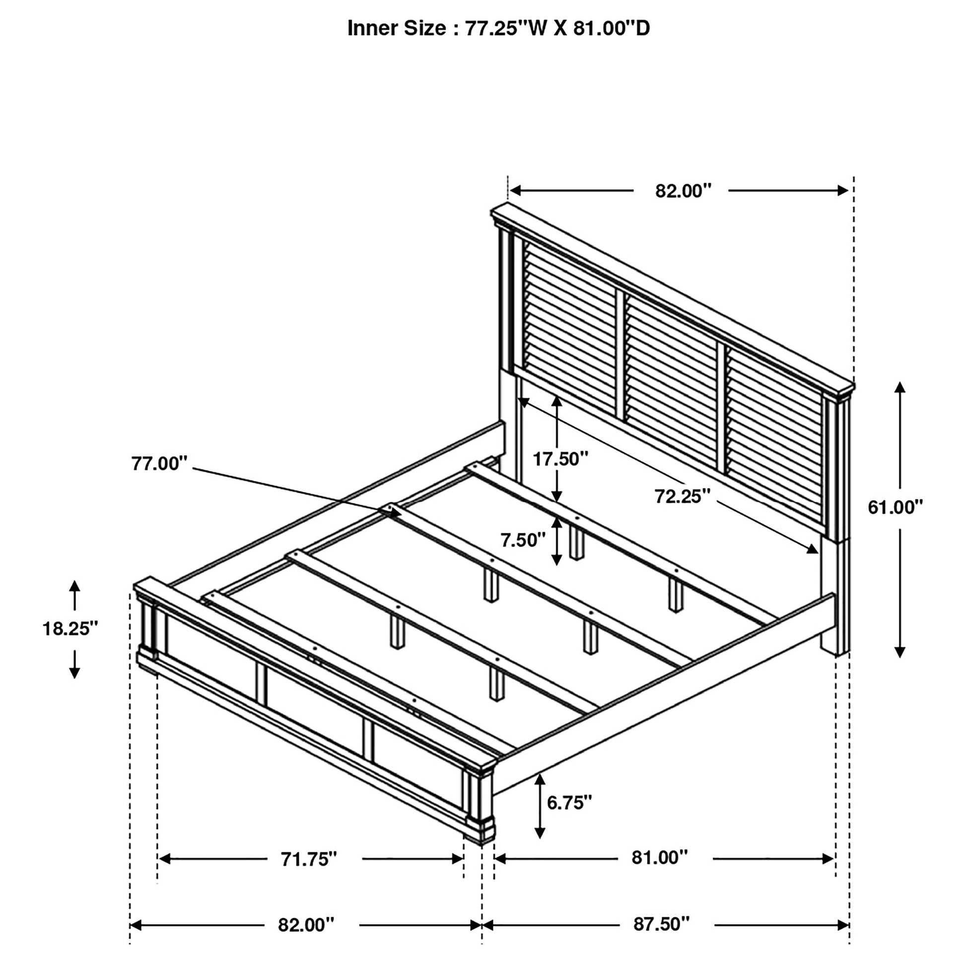 Achieve your dream of a country chic bedroom suite with this five-piece set. A lovely panel bed with a shutter-style headboard is the main attraction while the footboard is crafted with a solid panel design. Crown molding enhances all pieces, including the two-drawer nightstand, nine-drawer dresser, mirror, and five-drawer chest. The storage items are equipped with self-closing glides for your convenience. The entire set is tied together with a white finish and striking dark rum accents for a two-tone theme.