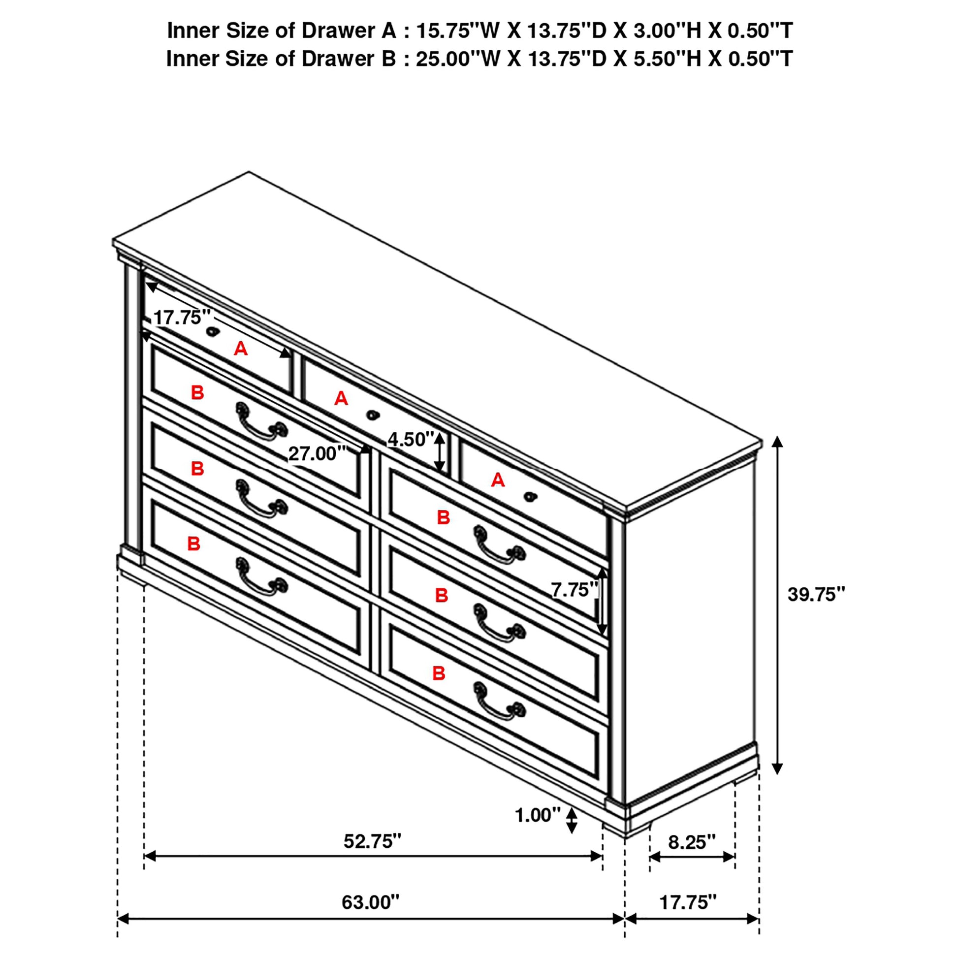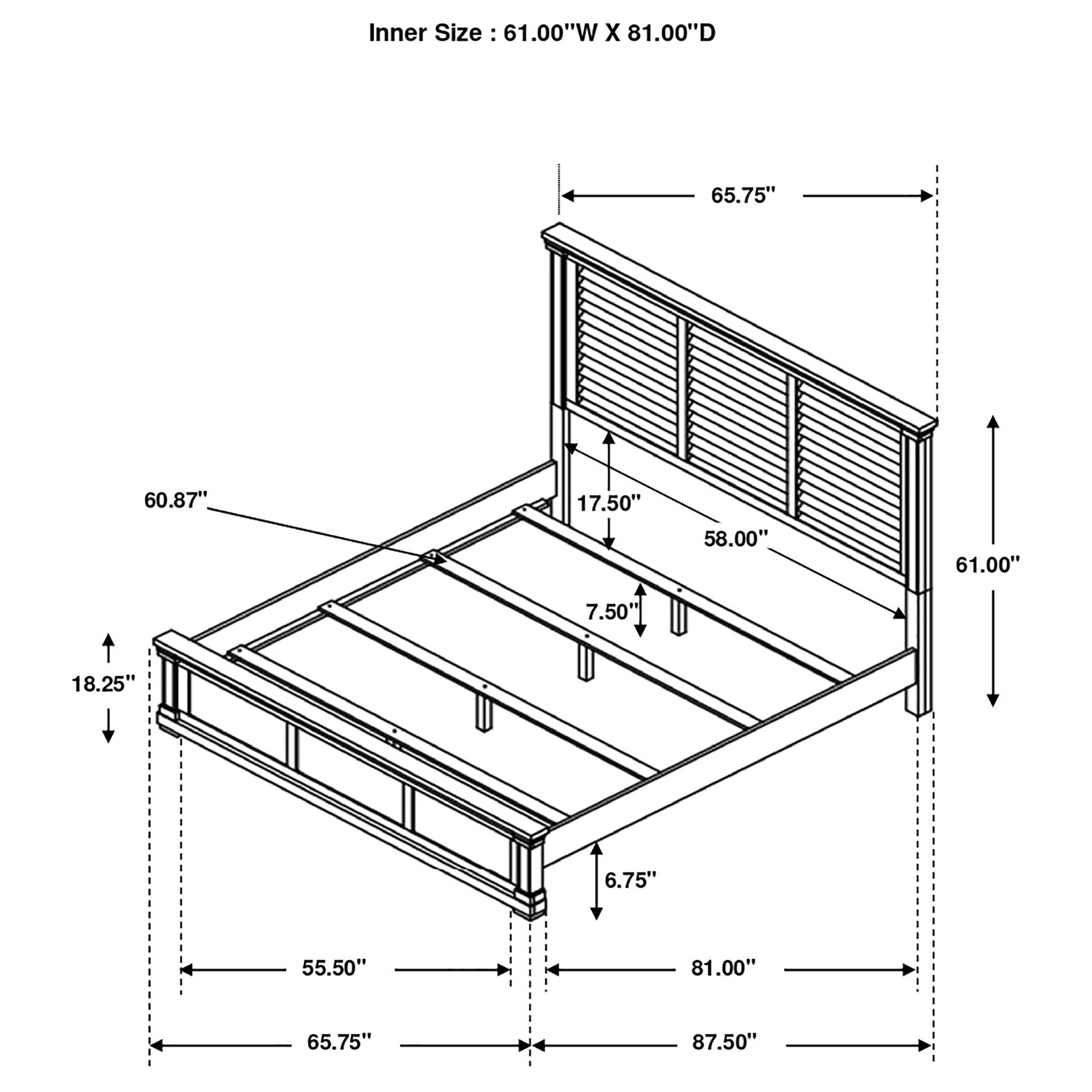 Achieve your dream of a country chic bedroom suite with this five-piece set. A lovely panel bed with a shutter-style headboard is the main attraction while the footboard is crafted with a solid panel design. Crown molding enhances all pieces, including the two-drawer nightstand, nine-drawer dresser, mirror, and five-drawer chest. The storage items are equipped with self-closing glides for your convenience. The entire set is tied together with a white finish and striking dark rum accents for a two-tone theme.