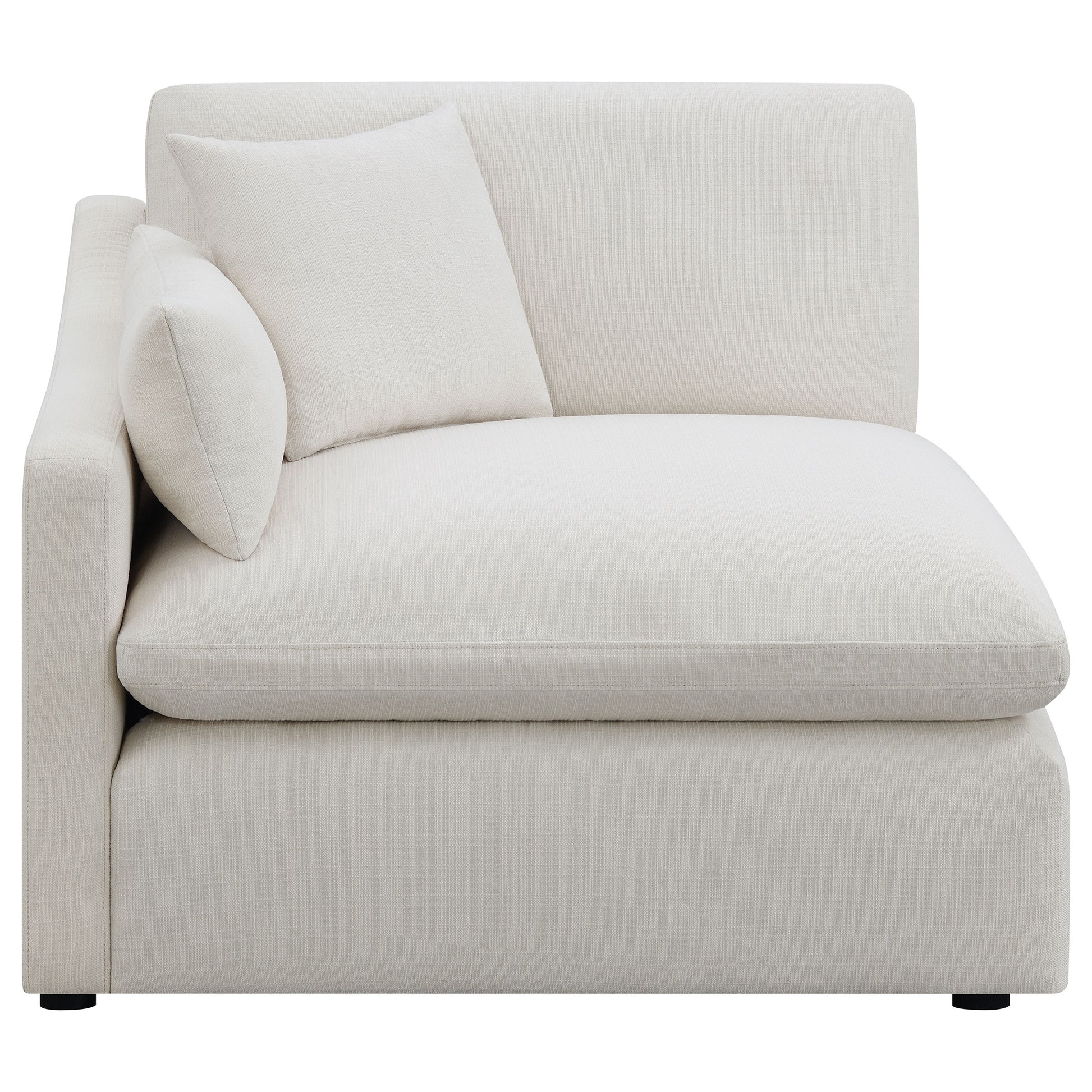 Feel your stresses melt away as you're embraced by the cushioned comfort of this right arm chair as part of a sectional for your den or living room. Upholstered in linen-like, the chair comes with a plush seat and back for enduring comfort. It also has sloped track arms accented by stylish topstitching. The treated fabric easily repels water and moisture so spills won't soak in before you wipe them up. This chair is the perfect end to your modular sectional showpiece.