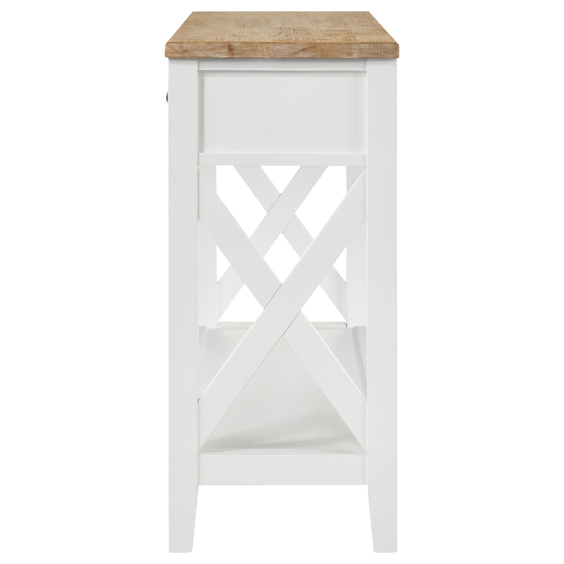 Create a finished look for a floating sofa or add welcoming flair in an entryway with this farmhouse console table. A two-tone design shows off an ash veneer table top with a wire brushed brown finish that assures natural appeal. The table base is done in cool white, offering clean, airy ambiance. Two drawers and an open lower shelf provide plenty of storage and display space, perfect for decor that lends personal touches to your home. Each side of the table adds an X-cross detail that brings farmhouse character and dimension perfect for contemporary casual living.