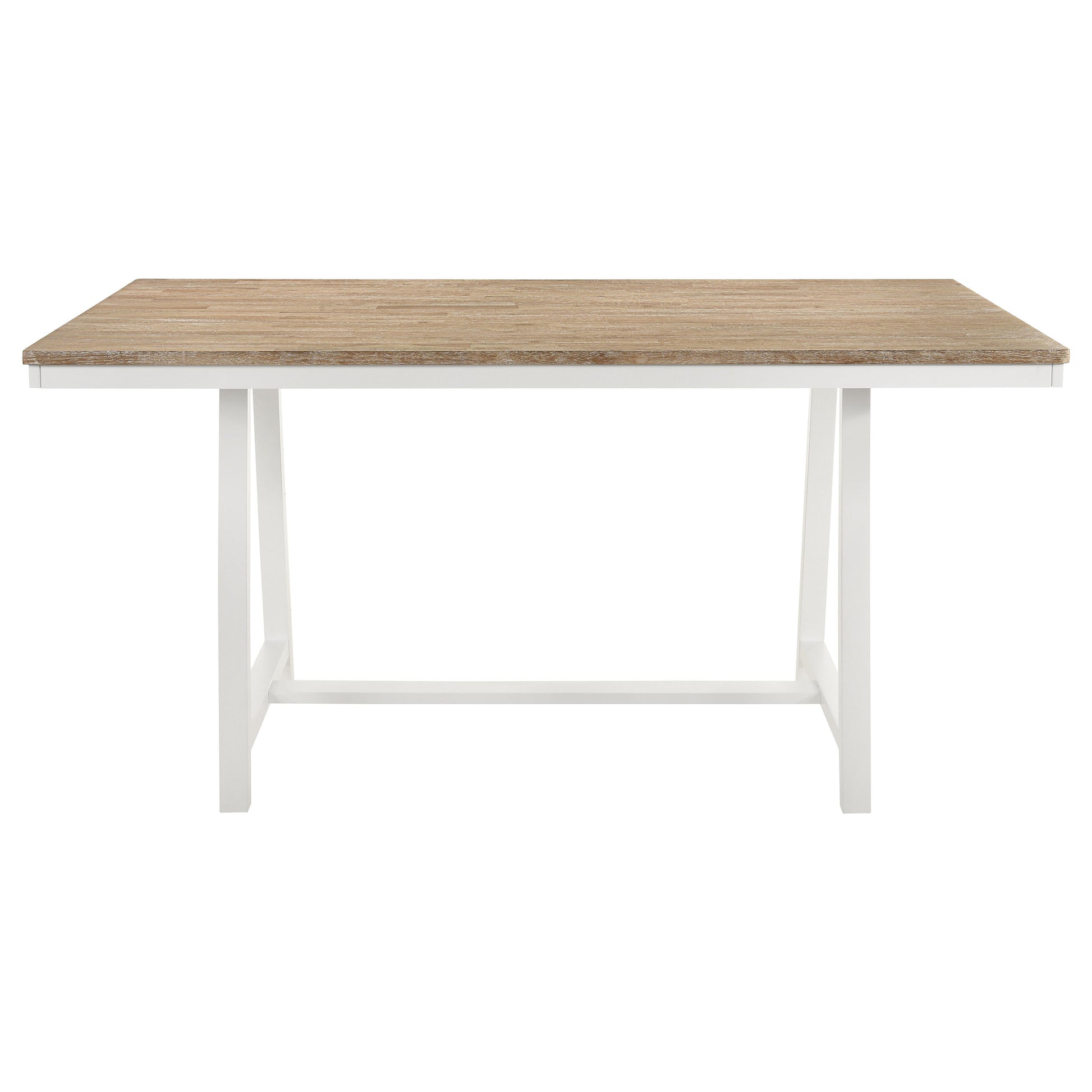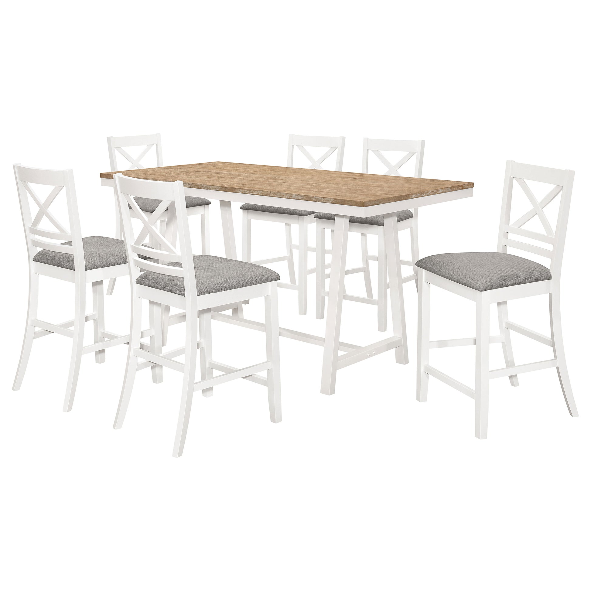 Gather with friends and family around a charming modern farmhouse counter height dining set. It centers on a stylish trestle table with a two-tone finish and includes six chairs to create a seven-piece set perfect or an inviting kitchen or dining room. The set boasts a two-tone finish combination of bright white and wire brushed brown wood grain, creating a touch of warmth while maintaining a clean, precise look and feel. Chairs include open X-cross backs for airy lightness, while padded seats add light gray upholstery for an on-trend touch with timeless appeal. This counter height dining set is ideal for everything from a quick breakfast to weeknight dinners with the kids, creating a pleasing centerpiece in your space.