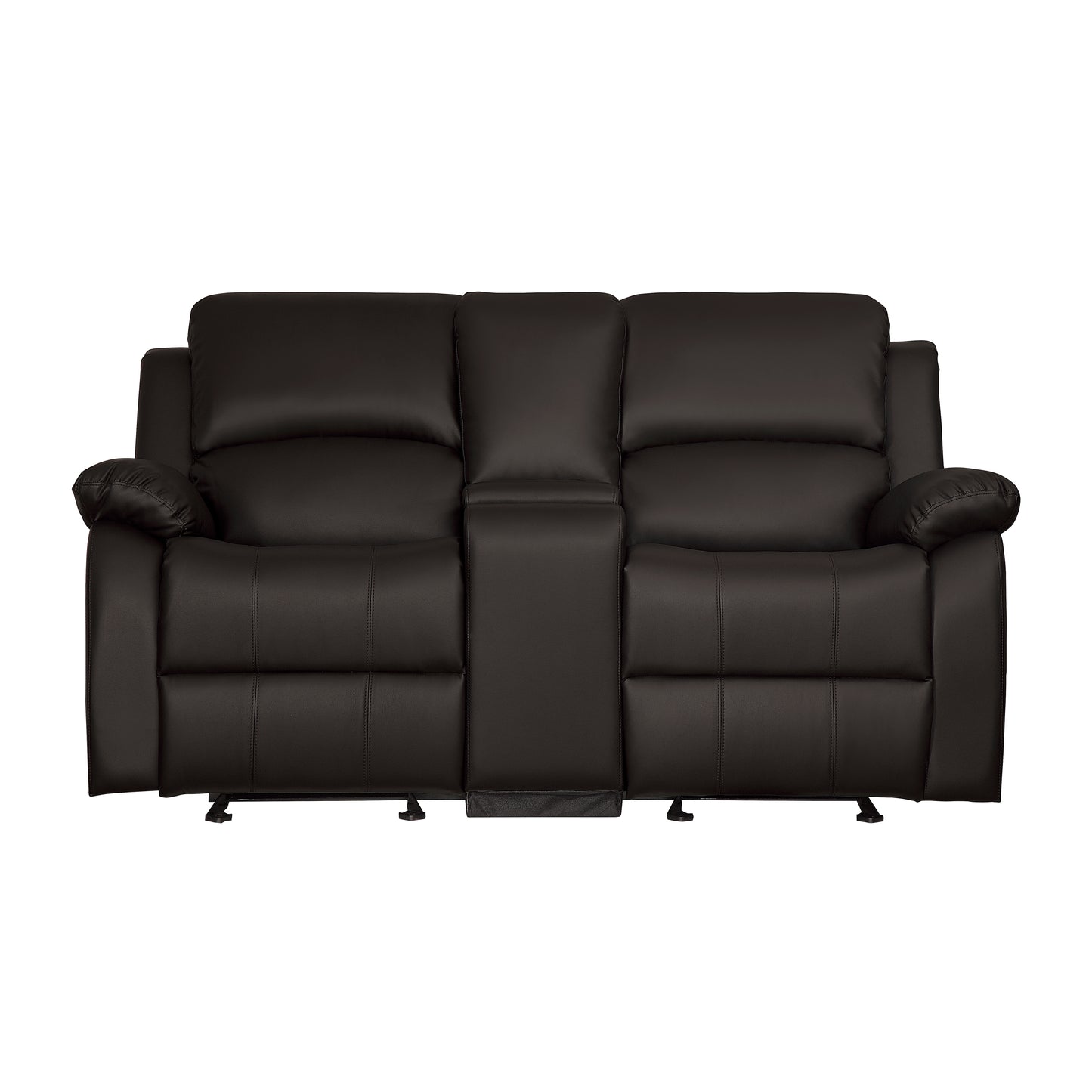 Introducing the Clarkdale Collection Loveseat by Homelegance, a perfect blend of style and comfort for any living space. Upholstered in dark brown faux leather, this transitional piece offers ample seating, making it an inviting spot for relaxation. The Loveseat features a center console equipped with dual cup holders and hidden storage, enhancing its functionality. With a solid wood and plywood frame, reinforced metal seat, and foam padding over pocket coils, it promises durability and support. Experience the gentle gliding motion and tab pull reclining feature, making it an ideal choice for unwinding after a long day.