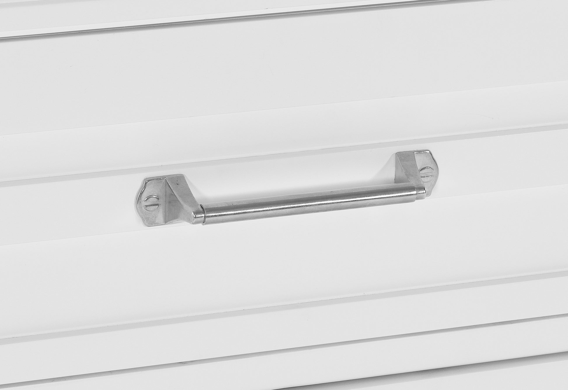 Crafted from a combination of wood and engineered wood, the nightstand boasts a pristine white finish that enhances its versatile appeal. The fixed handle pull hardware on the drawers adds a touch of sophistication, while the horizontal accent on the top drawer provides a striking visual contrast.