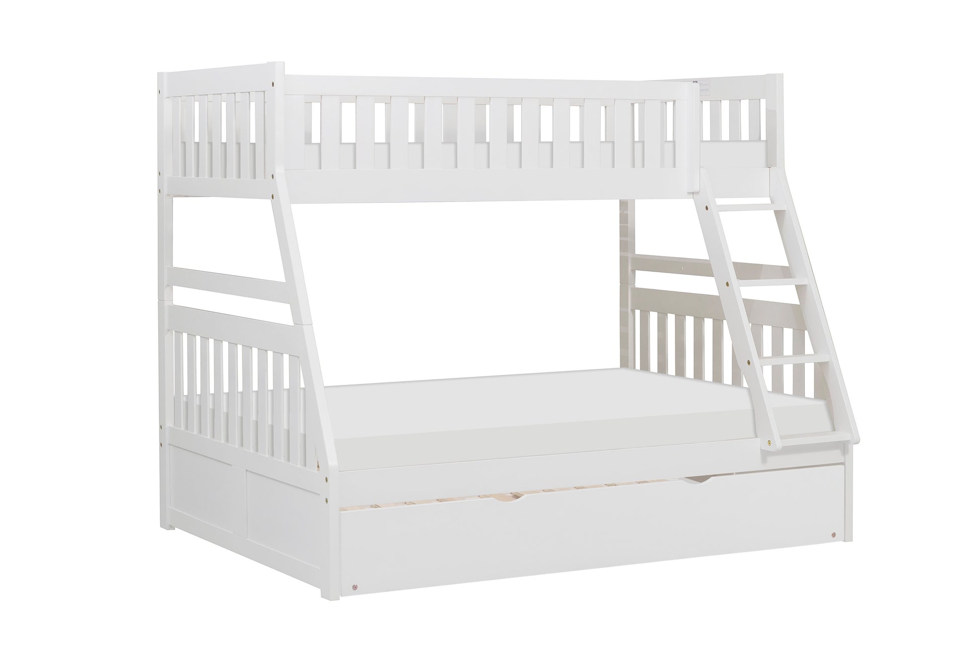Transform your child's bedroom into a stylish and functional space with the Homelegance Galen Collection Twin/Full Bunk Bed with Twin Trundle. This beautifully designed bunk bed maximizes sleep space while offering a chic white finish that complements various decor styles.