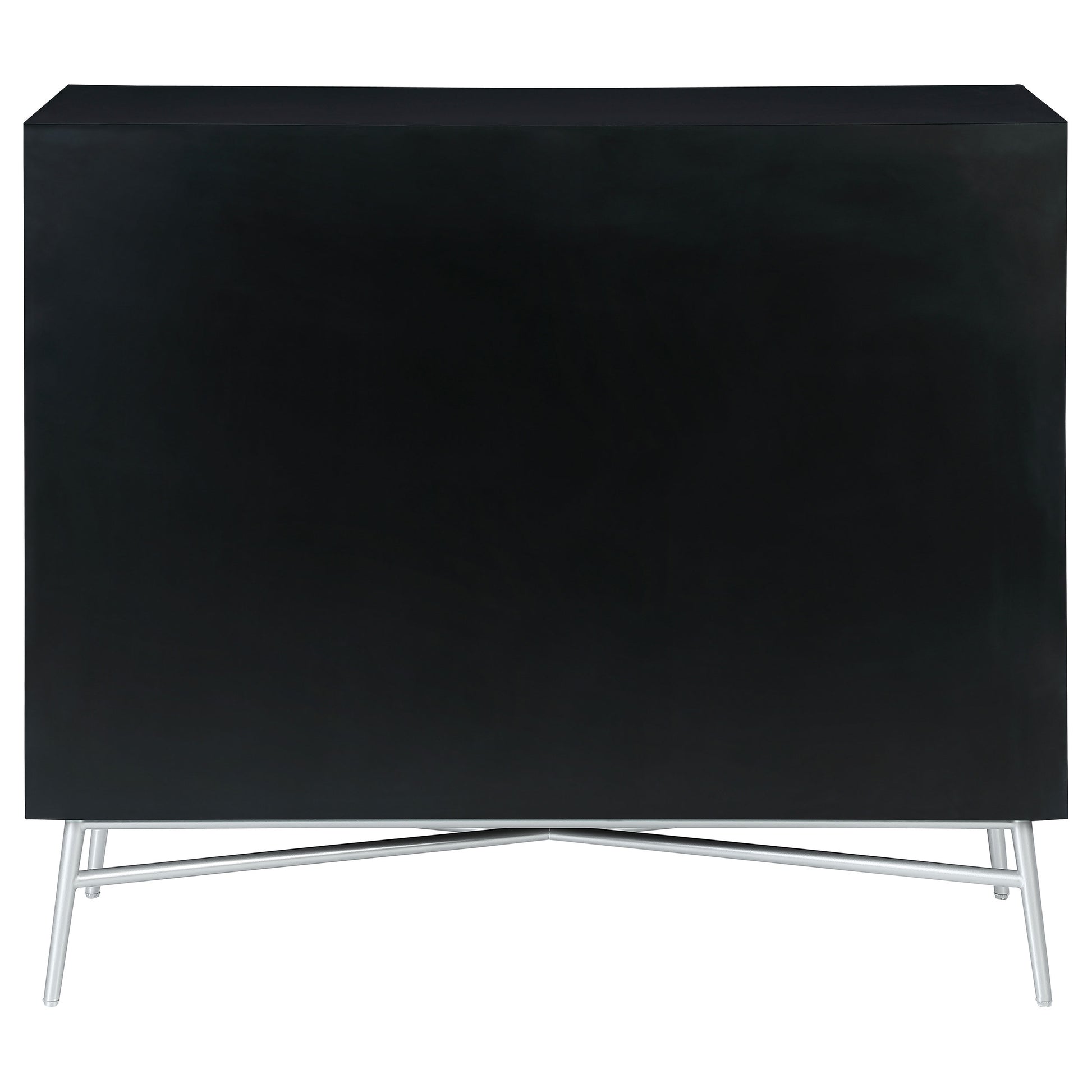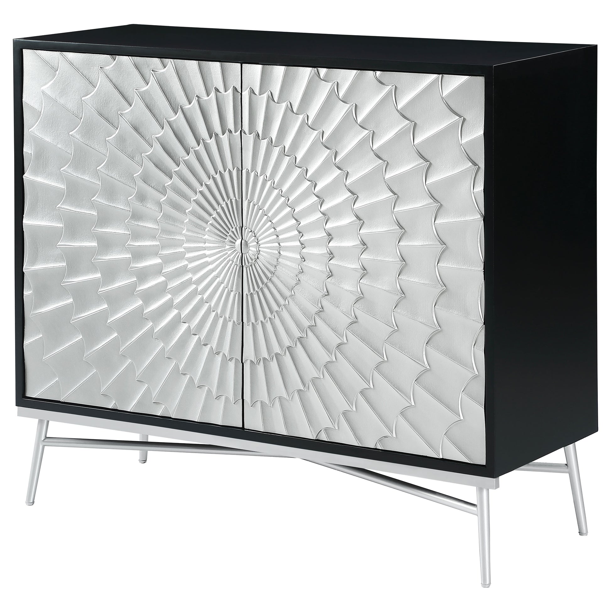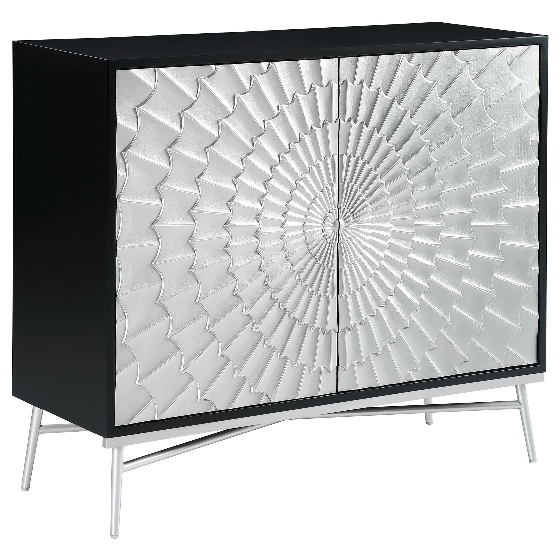 A radial sunburst design lends a striking Art Deco flair to this contemporary accent cabinet. Dual cabinets draw the eye further with a shimmering silver finish, wrapped in a boxy smooth black base to lend a contrasted effect. Tucked inside the dimensional cabinets is an adjustable shelf inviting storage of dishes, glassware, games, or other room accessories and essentials. The large cabinet rests on a sturdy metal cross-brace support with elegantly tapered legs. Mirroring the silver sunburst pattern is a silver powder coat finish on each of the legs and base.