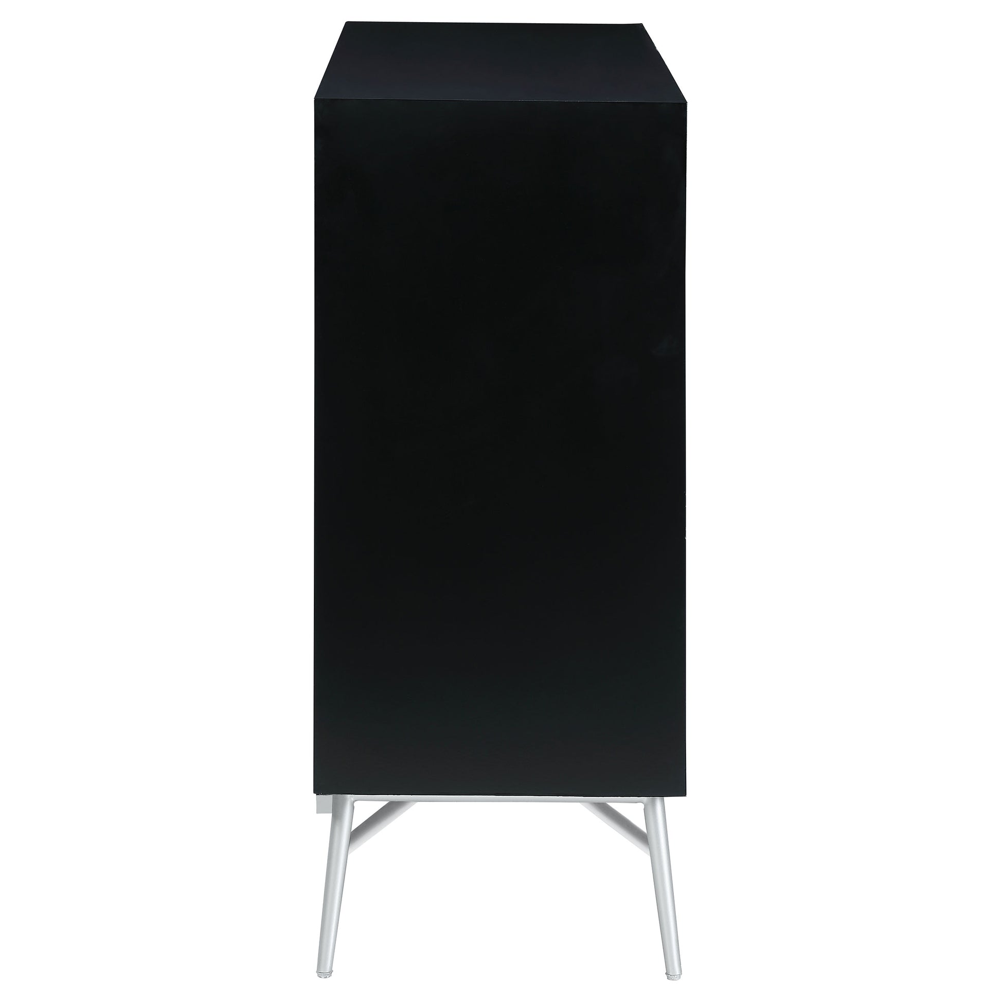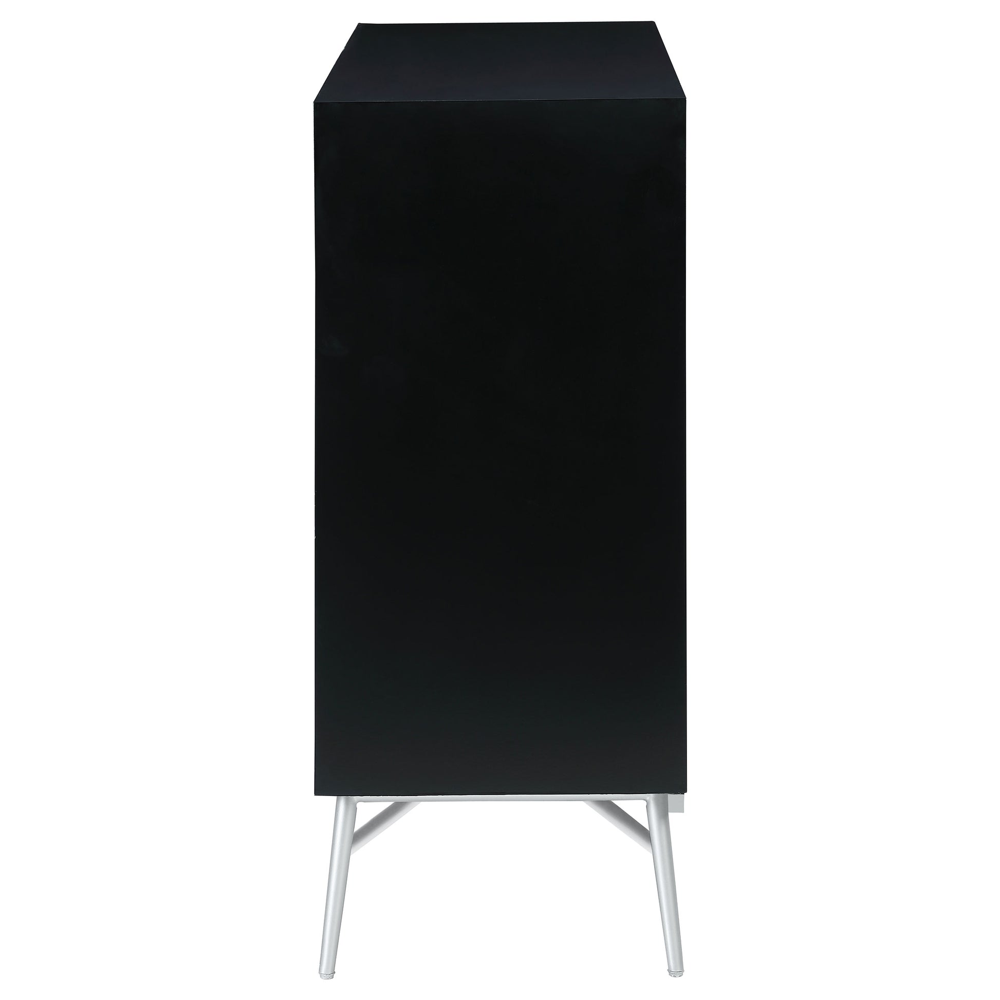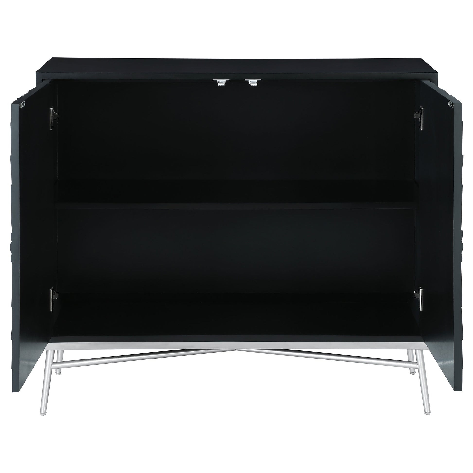 A radial sunburst design lends a striking Art Deco flair to this contemporary accent cabinet. Dual cabinets draw the eye further with a shimmering silver finish, wrapped in a boxy smooth black base to lend a contrasted effect. Tucked inside the dimensional cabinets is an adjustable shelf inviting storage of dishes, glassware, games, or other room accessories and essentials. The large cabinet rests on a sturdy metal cross-brace support with elegantly tapered legs. Mirroring the silver sunburst pattern is a silver powder coat finish on each of the legs and base.