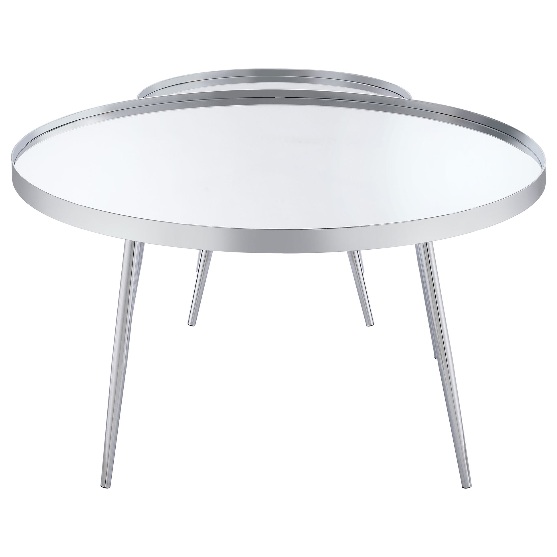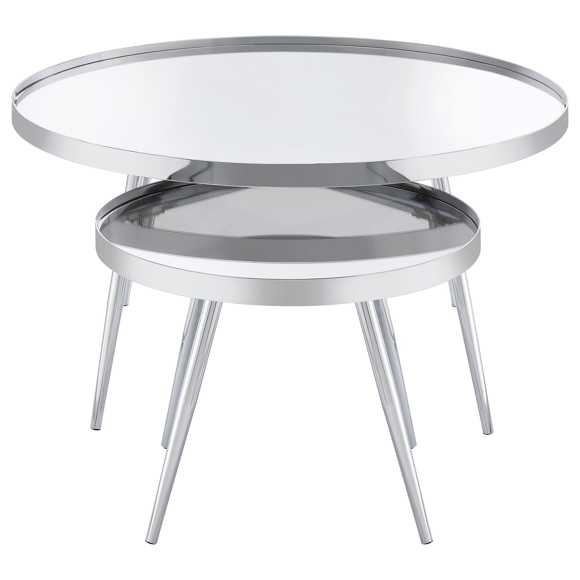 Sleek surfaces and clean lines bring all eyes to a pair of nesting coffee tables that brim with contemporary energy. The tables mirror one another in everything but size, with the smaller table tucking underneath its larger counterpart to conserve space or create a waterfall effect that's sure to enchant. Round tabletops feature a raised lip and mirrored glass that adds bright reflectivity. Splayed legs ensure stability and show off a gleaming chrome finish. Together or apart, this table set is a chic choice for a stylish but welcoming living room.