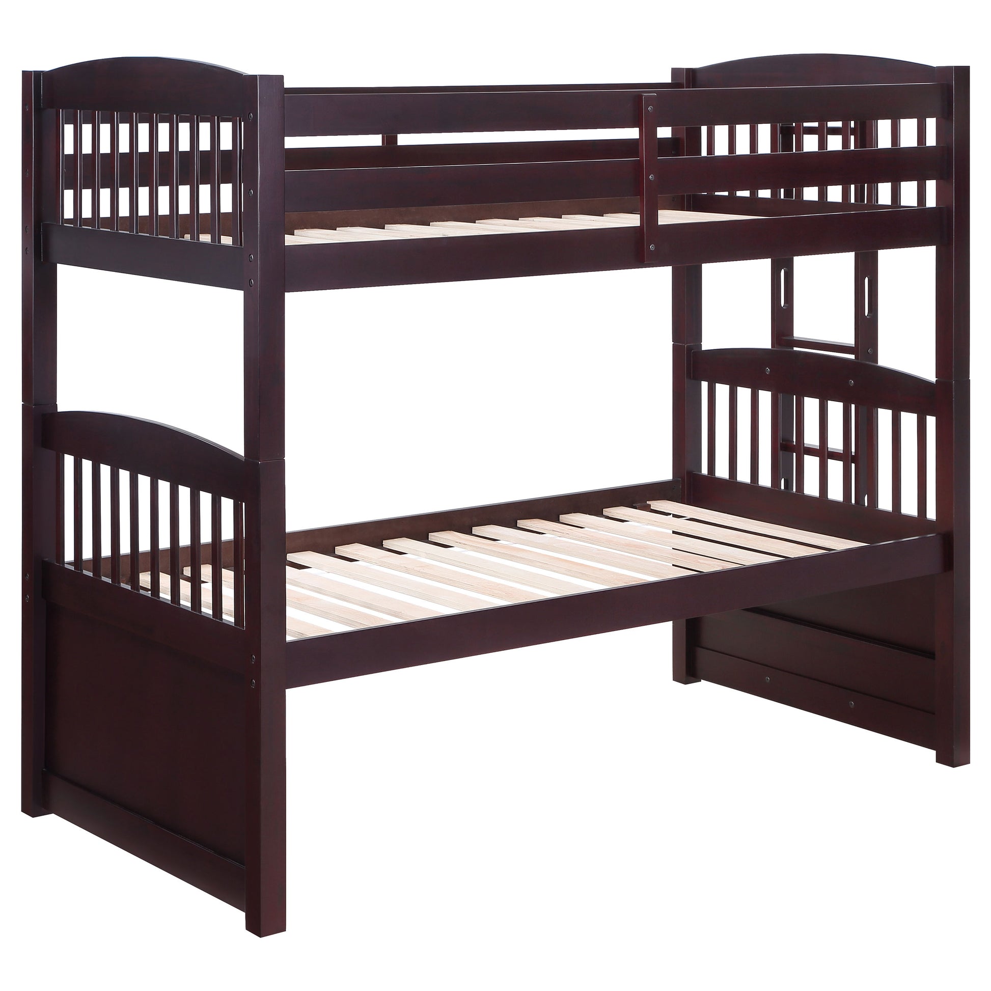 - Appealing twin over twin bunk bed in rich cappuccino finish
