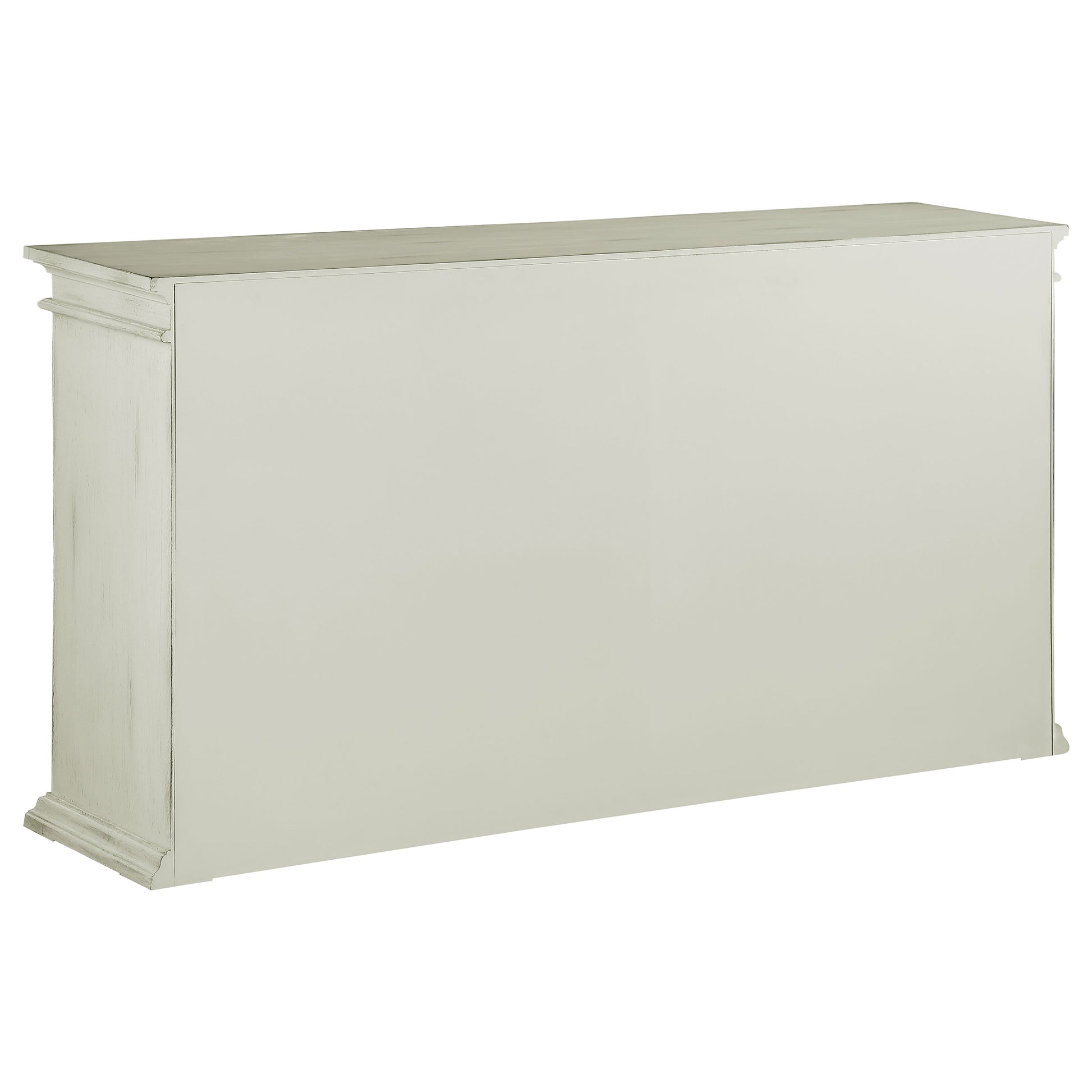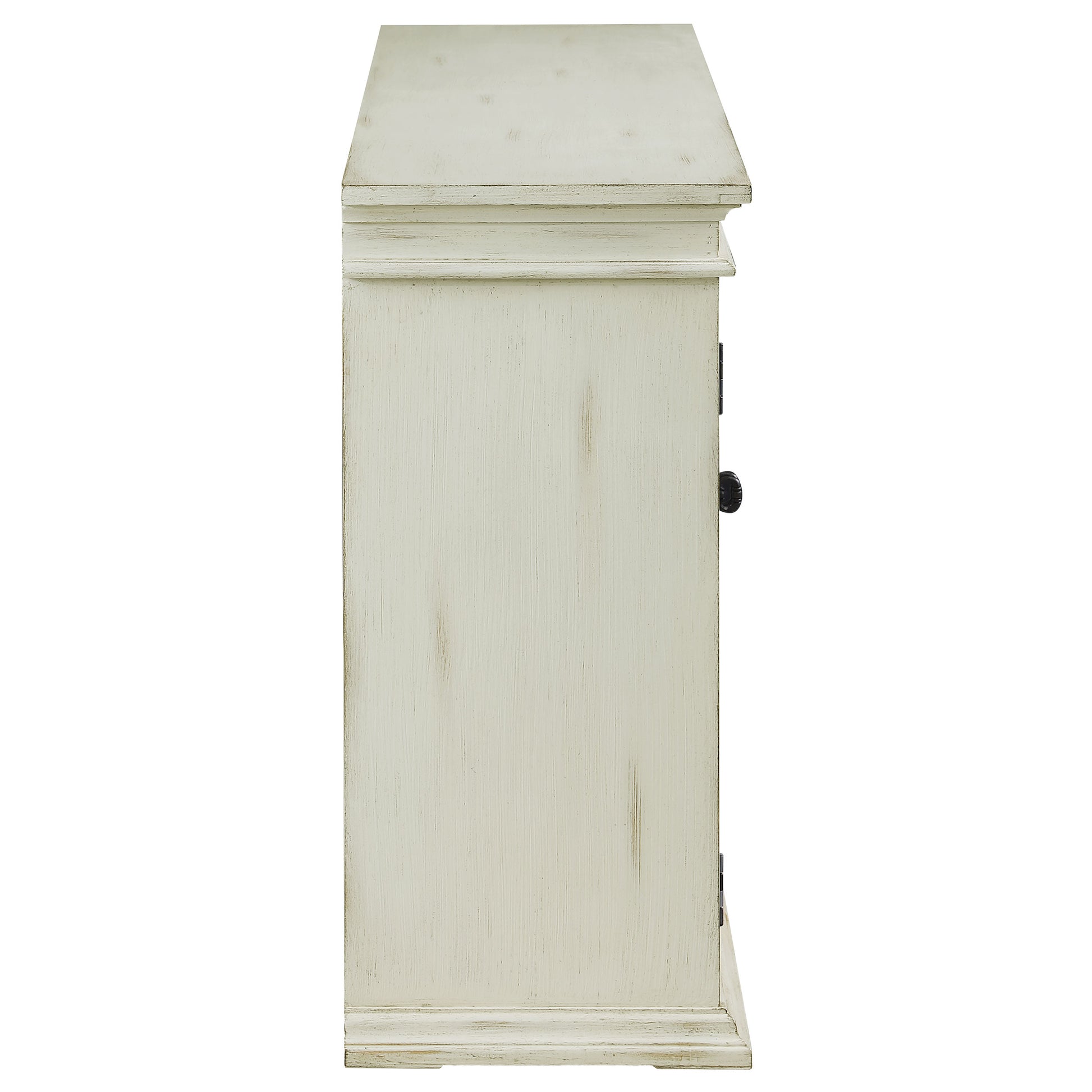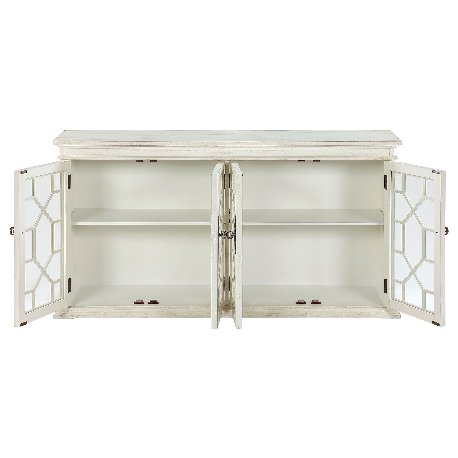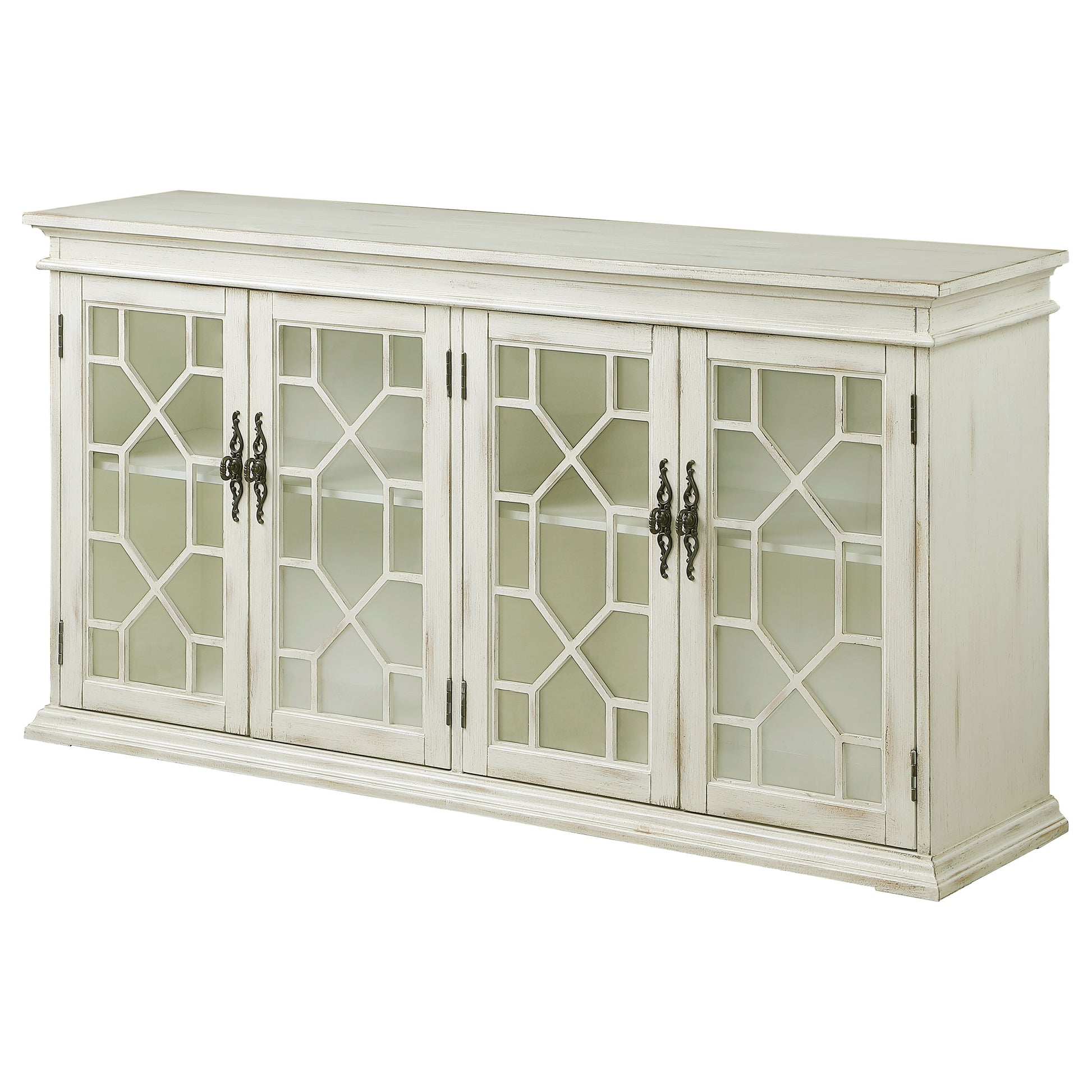 Charming traditional accents add a classic charm to this rustic accent cabinet. Covered in a weathered white finish, this long and spacious cabinet invites you to showcase personal belongings and decor behind dual glass pane doors. Adding to the timelessness of this furniture piece is a fretwork motif across each door, along with antique-inspired pulls. Crown molding details and a flush base define the silhouette of this accent cabinet and add a flare to the edges. Inside are also adjustable shelves, allowing you to raise or drop to accommodate taller items.