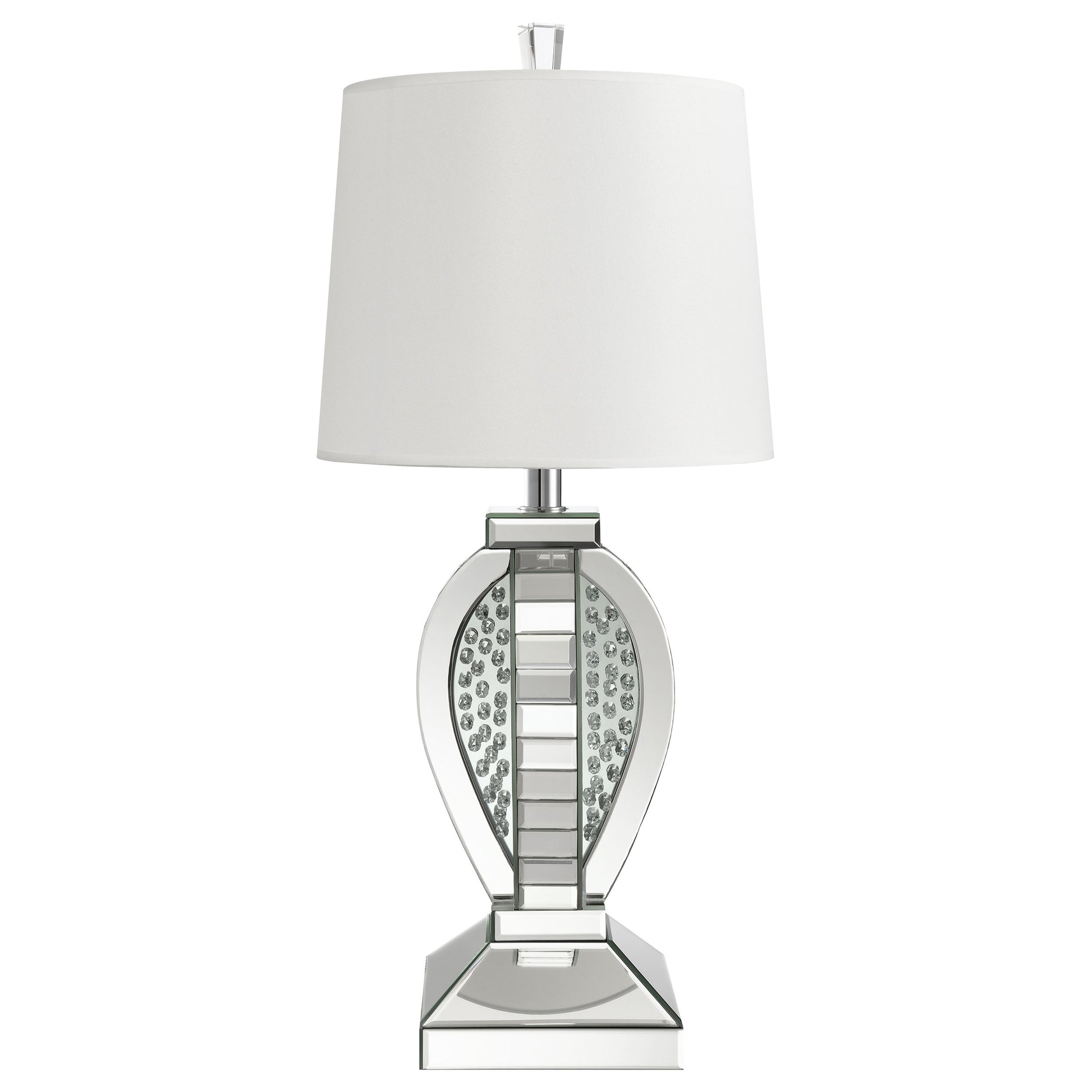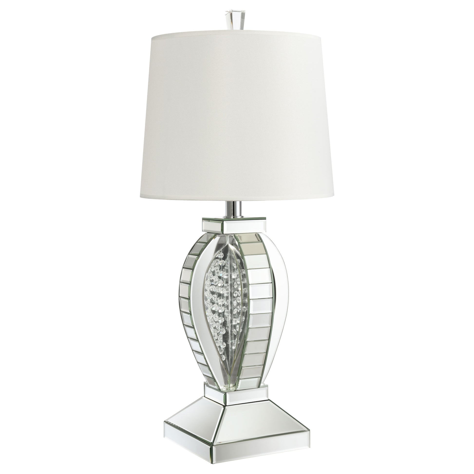 This contemporary table lamp offers an exquisitely detailed and elegant base, complete with mirror tile accents. Faux crystal accents tucked within the base sparkle outward, creating a luxe look. Contoured edges lined in polished mirror tile reflect the colors around it and project additional glow. Topped with a crisp white drum shade with a subtle tapered top, this stylish table lamp emits a serene, comforting glow next to a seating area. A single switch turns off the table lamp effortlessly, saving energy when not in use.