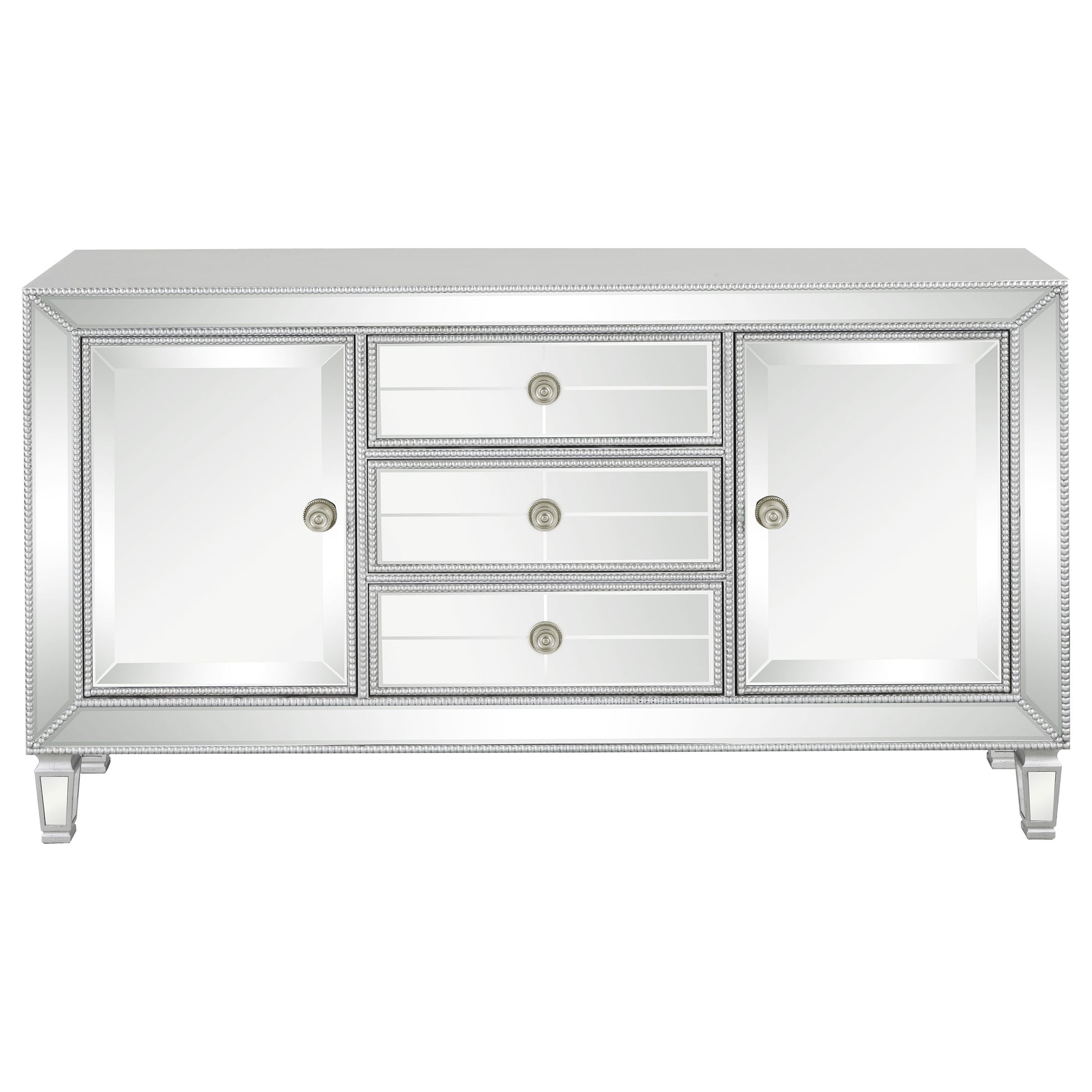 - Front mirror doors dress and three center drawers dress up this contemporary accent cabinet